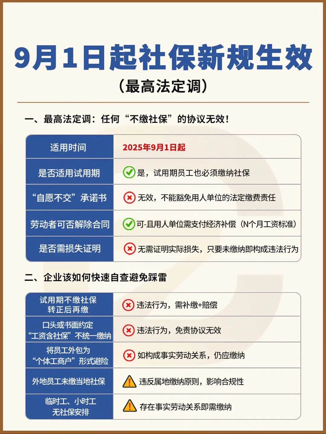 社保新规:任何“不缴社?!钡男槲扌В?月1日起生效,用人单位和劳动者必须依法参加社会保险、缴纳社保费,否则企业将面临劳动仲裁和经济补偿。