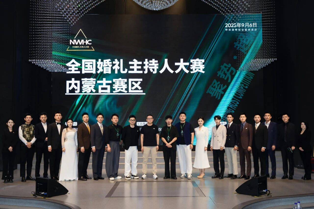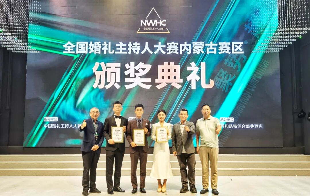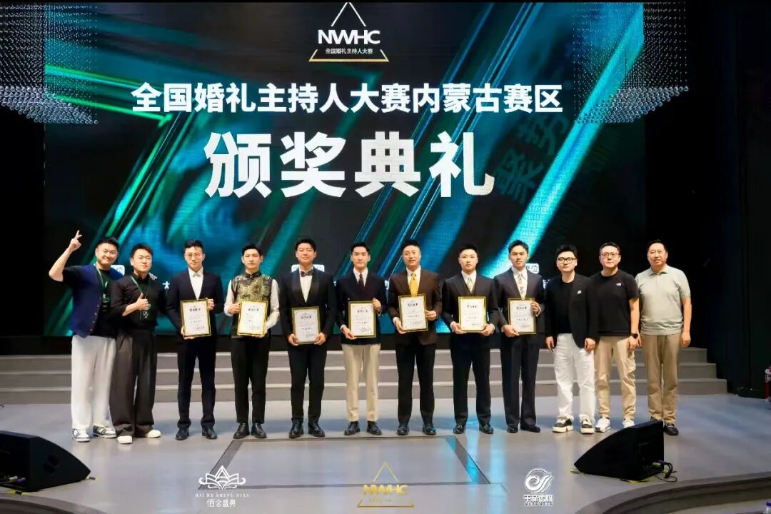 中国传统文化促进会结婚产业委曹仲华主任,内蒙古婚庆礼仪行业协会闫嘉文会长,全国婚礼主持人大赛组委会常真副主任先后为获奖选手颁奖,并会同评委和参赛全体选手集体留影。