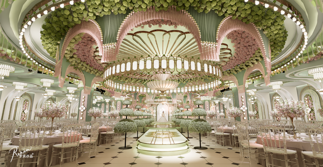 法式风格强调对称美,以精致的线条著称,法系与现代轻奢碰撞,藕粉搭配青绿,浪漫气氛缓缓柔化整个宴会厅。