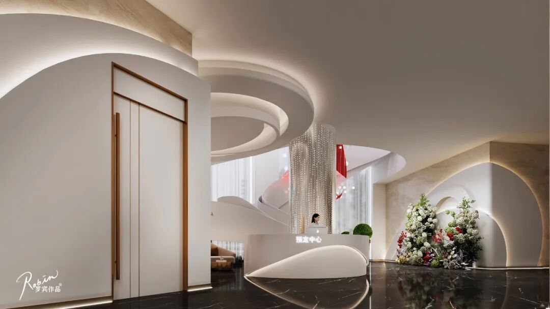 初入前厅,优雅线条与现代感材质构建出时尚而沉稳的空间特质。接待台简洁高效,平衡美学与功能,微妙地转换人与空间的关系,丰富体验层次。