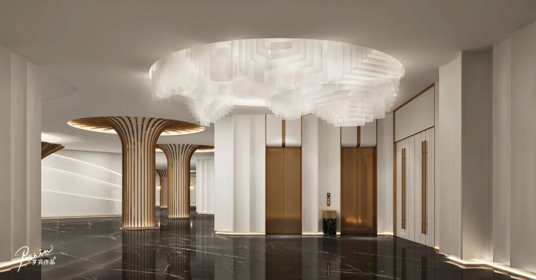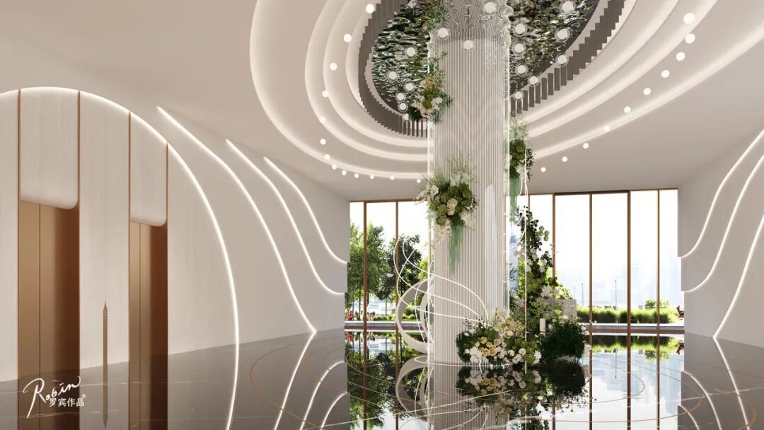 电梯前室用线性元素结合花艺来突出立柱形象,不仅优化空间布局,还增强公区的艺术性和宴会感。