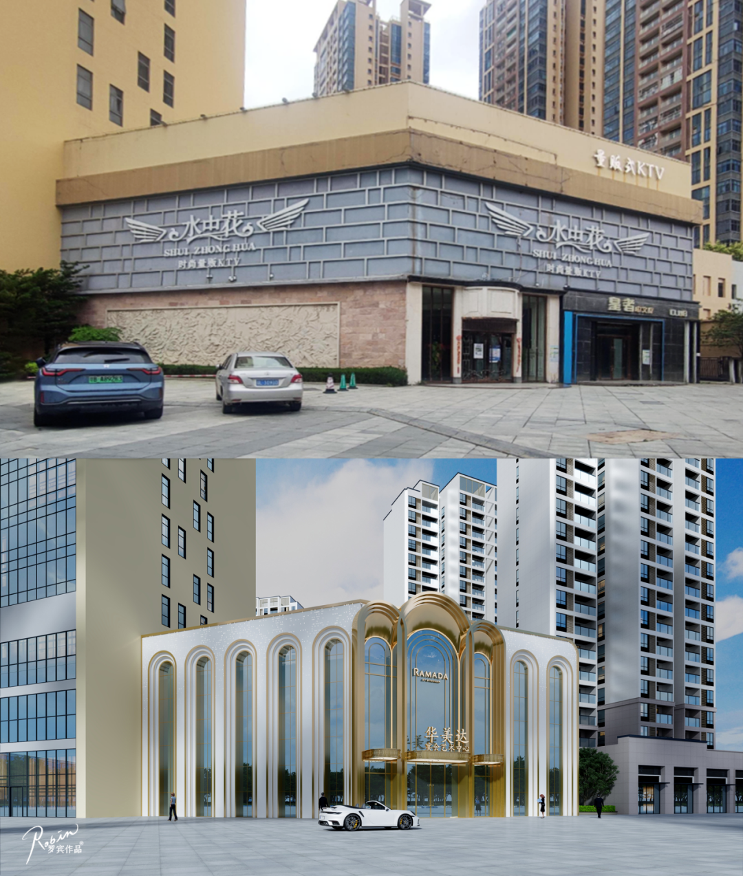 KTV物业改造升级,打破原有格局从外立面到经营空间进行全面重塑,打造集婚宴、商务、住宿、娱乐于一体的宴会中心。