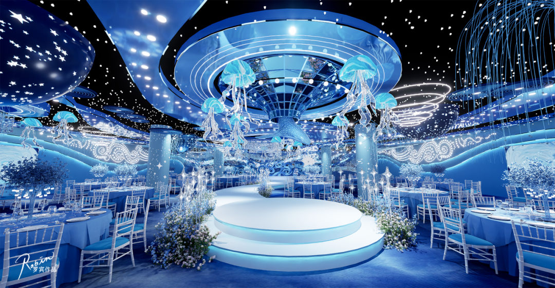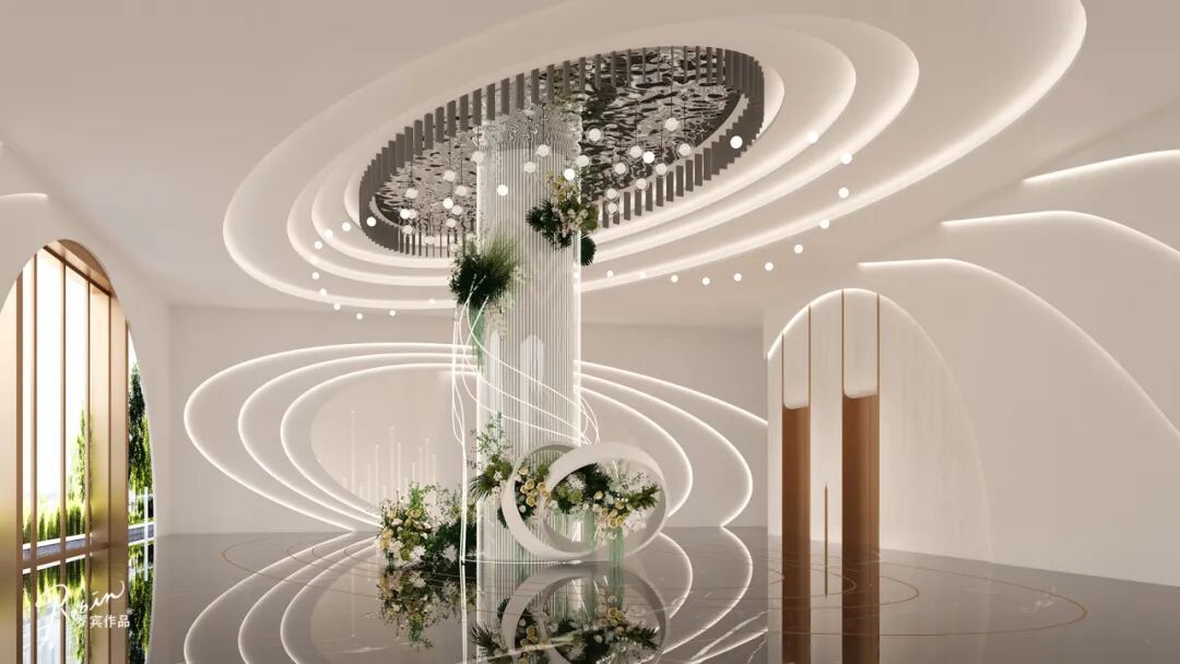 纹理层叠、水晶通透、镜面映射,整厅承载着对爱情纯粹与坚韧,融合了现代宴会审美与浪漫情怀。