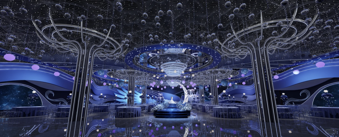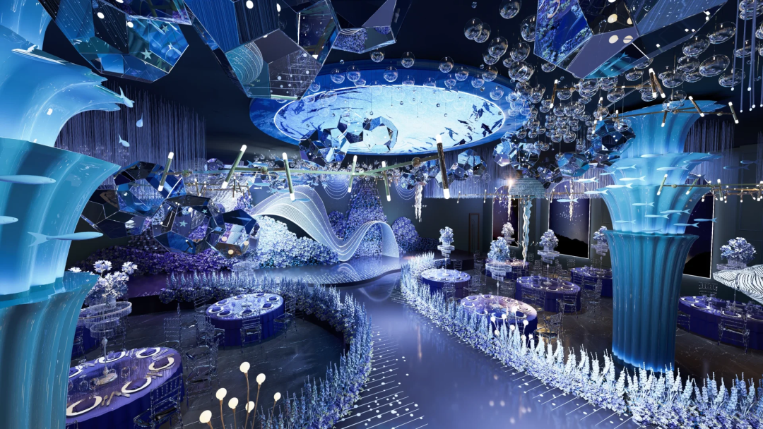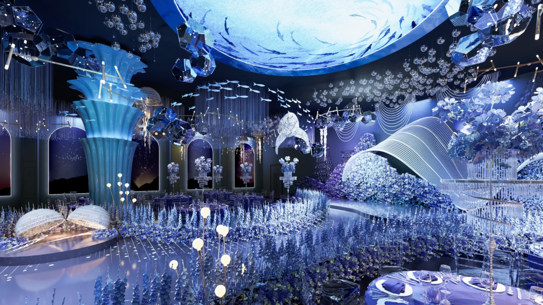 场地中央,是深蓝色的舞台,华丽而壮观。在这里,新人将成为海洋的主角,演绎着属于他们的爱情故事。周围的装饰除了海洋元素,也铺陈了大面积蓝紫色的花朵,交替营造出一个梦幻而浪漫的海底世界。