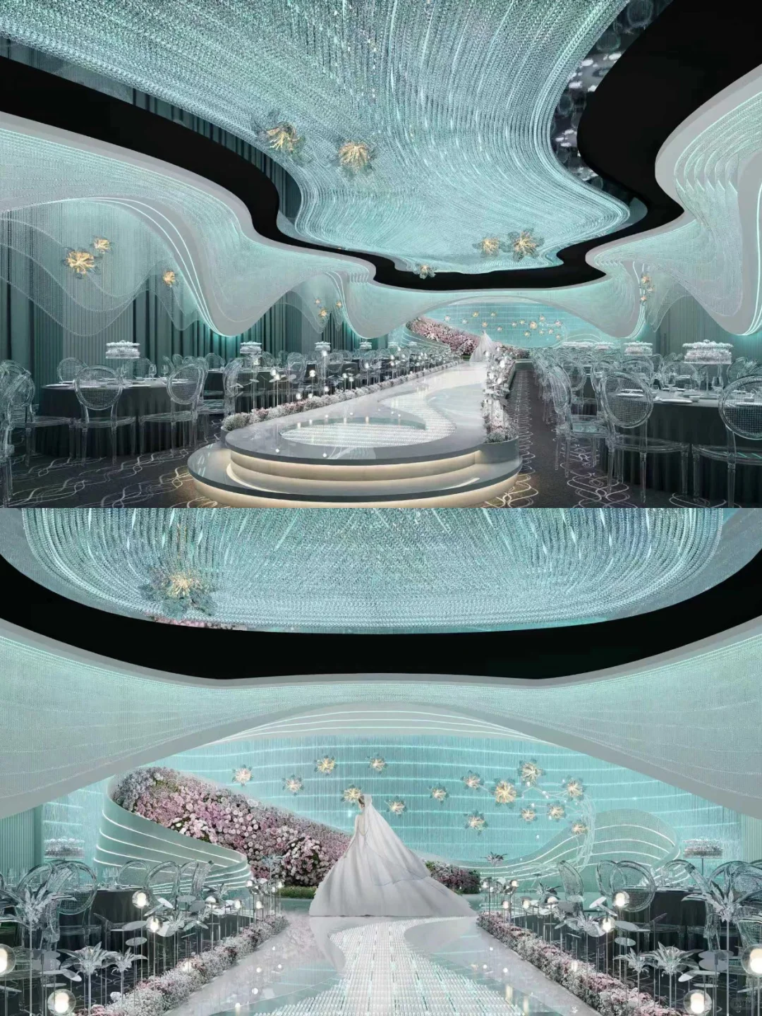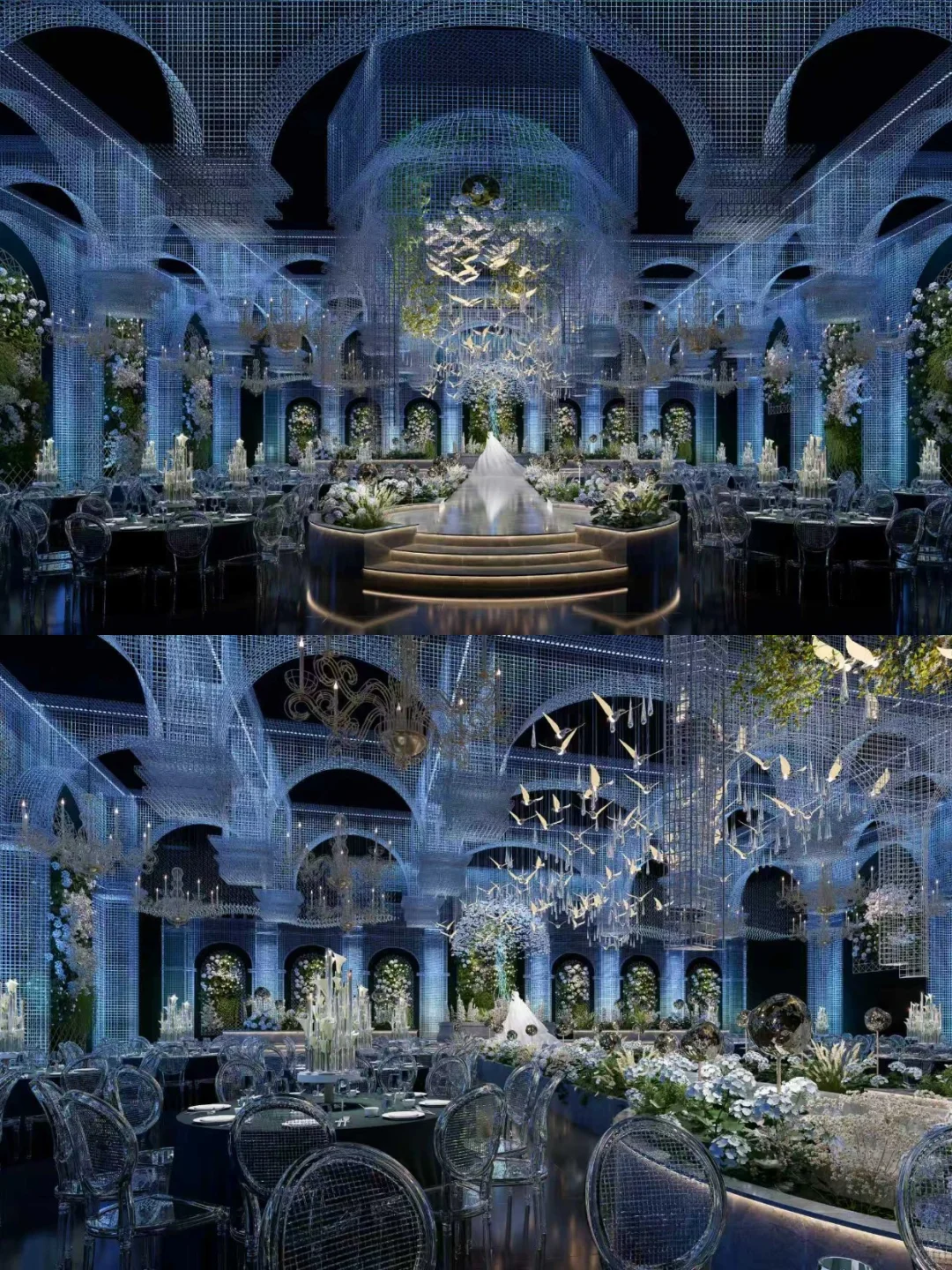 风格是静谧的星空浪漫感,适合对层高要求不高,但注重氛围感的姐妹。16桌的小型婚礼选这里,能把预算花在刀刃上!