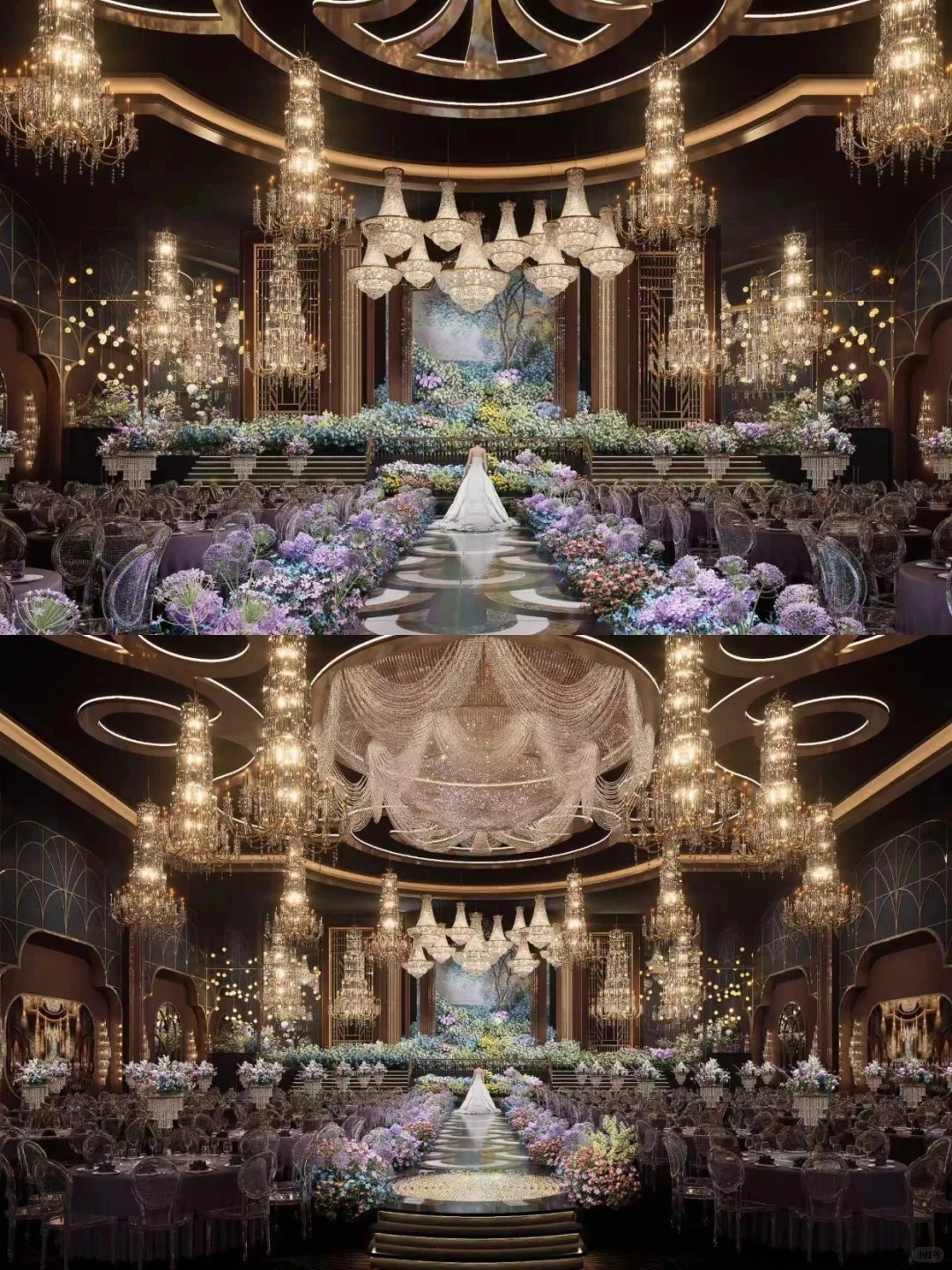暖金色灯光透过水晶洒下,和花艺色彩交织,复古又华丽,像置身法式宫廷的秘密花园~仪式区背景墙如立体自然画卷,新娘站中间时,真像从画里走出来的公主。