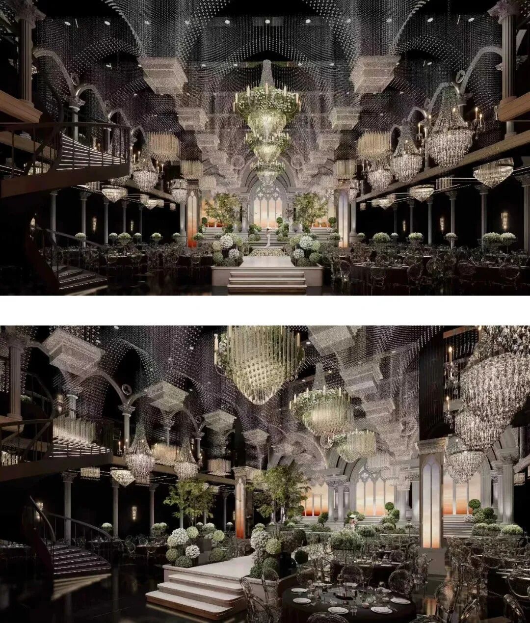 深浅不一的植物成为整场婚礼的呼吸感点缀——仪式区中央的花园造景中,挺拔绿植与圆润球形灌木相依,在水晶灯与复古穹顶的优雅背景下,这些绿意如同天然滤镜,柔和了华丽,注入了生机,既有仪式感,又不失松弛自然的呼吸感。