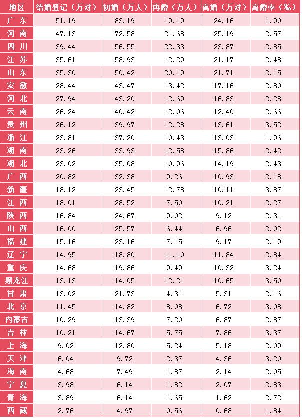 数据显示,去年我国结婚总人数最多的是广东省,为51.19万对,也是去年全国唯一一个结婚登记超过50万对的省份,且已连续三年位居全国第一。其中,去年广东初婚人数为83.19万人,再婚人数为19.19万人。
