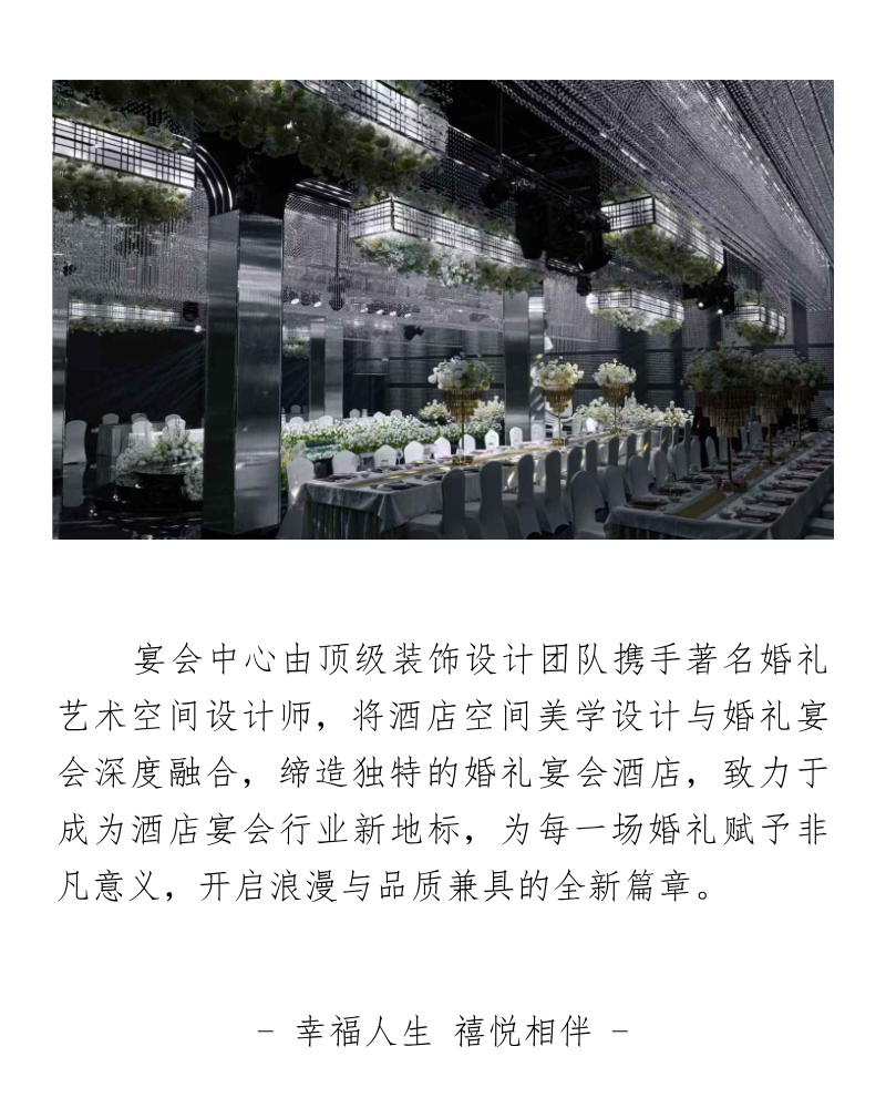 酒店通过艺术的宴会空间、独特的婚礼风格、品质的宴会餐饮和深度沉浸式的体验服务,为客户提供高品质一站式的婚礼婚宴解决方案,致力于成为宴会酒店行业的标杆。正如工作小组的宗旨所示,争创全国星级婚礼酒店,在行业内树立榜样的力量!