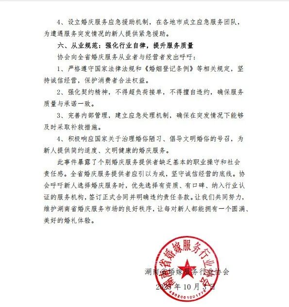 针对此次事件,湖南省婚嫁行业协会发布声明,强烈谴责破坏婚庆市场秩序行为,并部署全行业自查自纠。