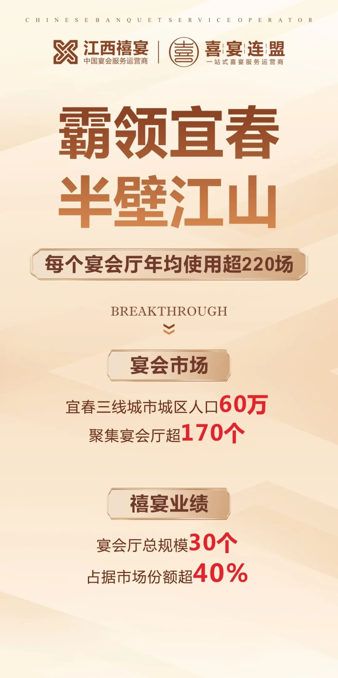 禧宴集团凭借30个宴会厅的规模,在“城区人口仅60万、聚集170+个宴会厅”竞争激烈中,实现“占据市场份额40%+、每个宴会厅年均使用220场+”硬实力业绩。