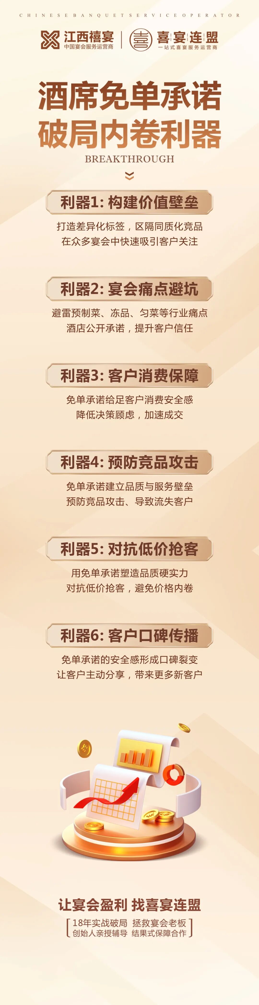 作为实体宴会酒店老板,我们深知宴会厨房内幕和宴席菜品痛点。当我们以“10大免单承诺“给足客户消费安全感,消费者以复购与口碑给予回馈,让我们酒店持续赢得市场竞争力。