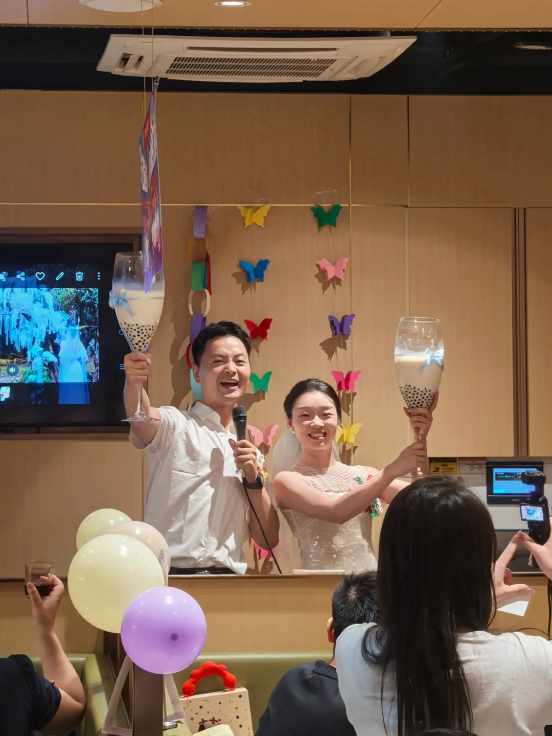 我们整个婚礼主打“快乐无负?!?。用餐原则为宾客全程自助,任意锅底、任意加菜,而我和先生全程举着超大红酒杯串场敬酒,但酒杯里面装的是三大杯珍珠奶茶,端杯时我才意识到原来三杯奶茶那么重,给我把肌肉都举出来了。