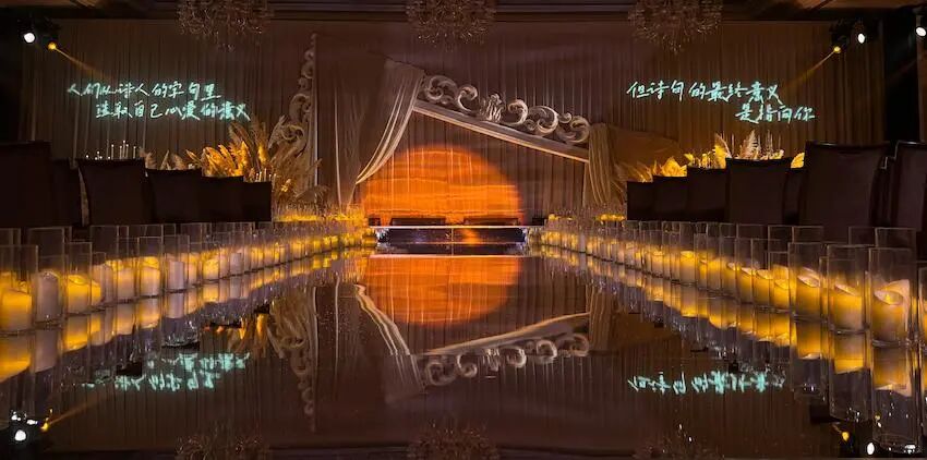 她分享了一个令人印象深刻的案例:“我们为一对在北京后海初遇的新人设计婚礼,新娘回忆起那天罕见的世纪晚霞时,眼里有光。那种瞬间把我们拉回过去的感染力,成了整场婚礼的设计原点。于是,我们将主舞台设计成一个半沉入水中的巨大相框,并用一块巨大的柔软布幔蒙住,只在中央掀开一角。这寓意着,在婚礼这天,他们共同掀开了时光的帷幕,重回故事开始的地方?!?/span>