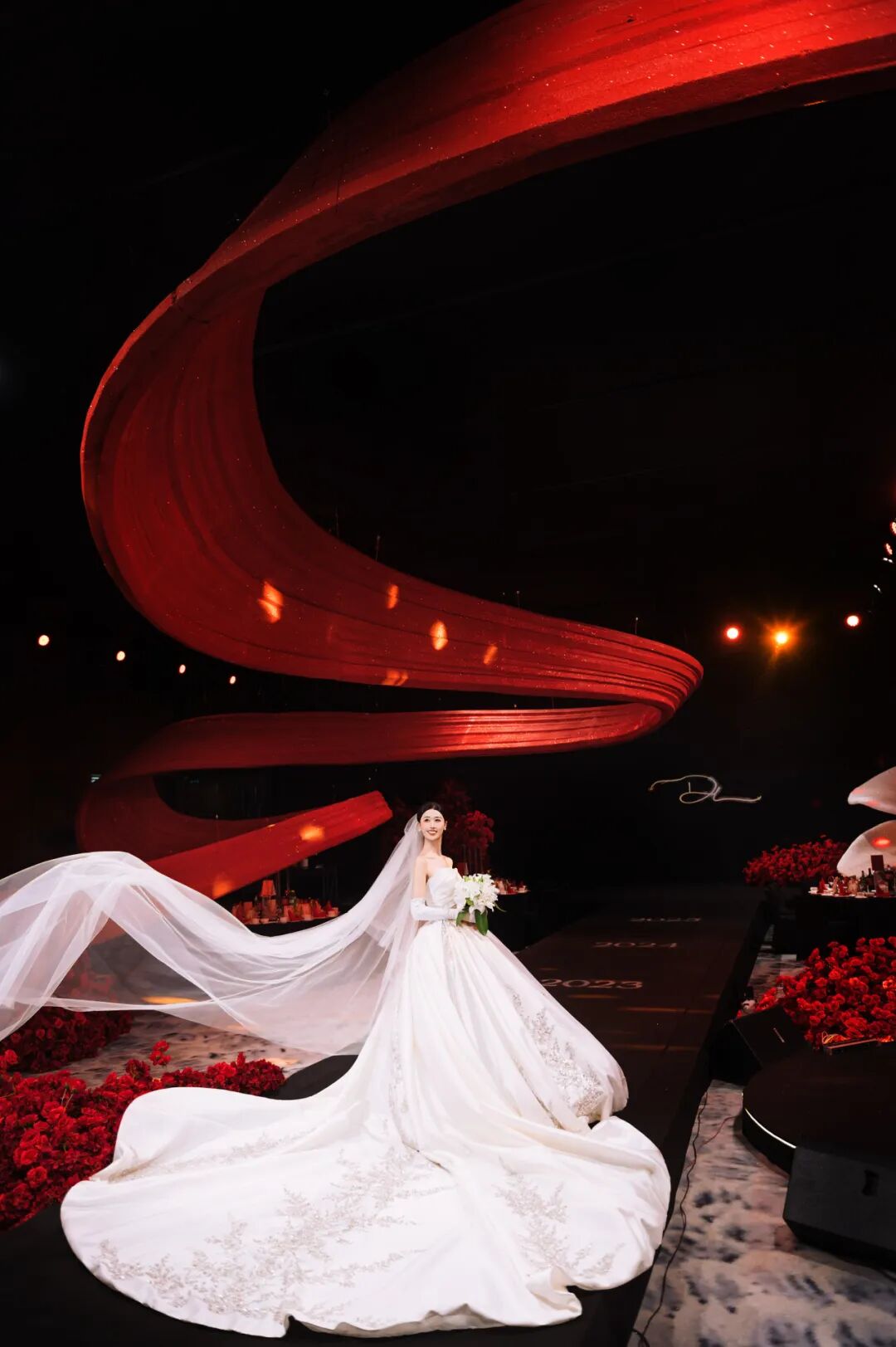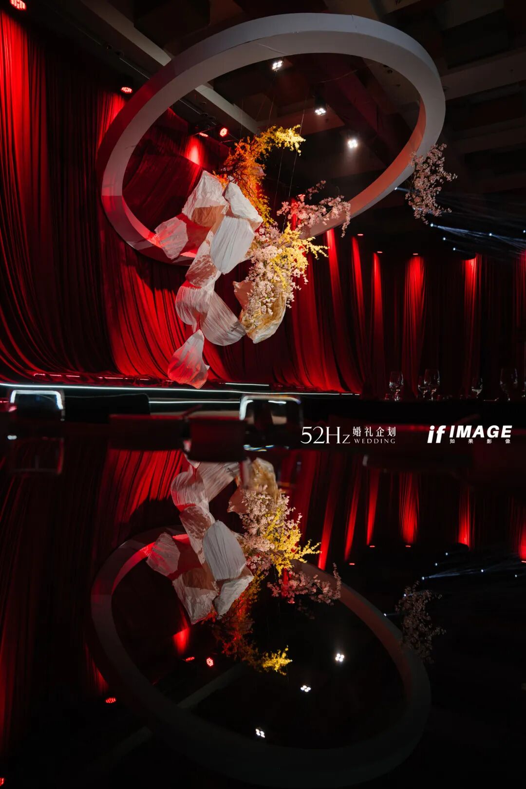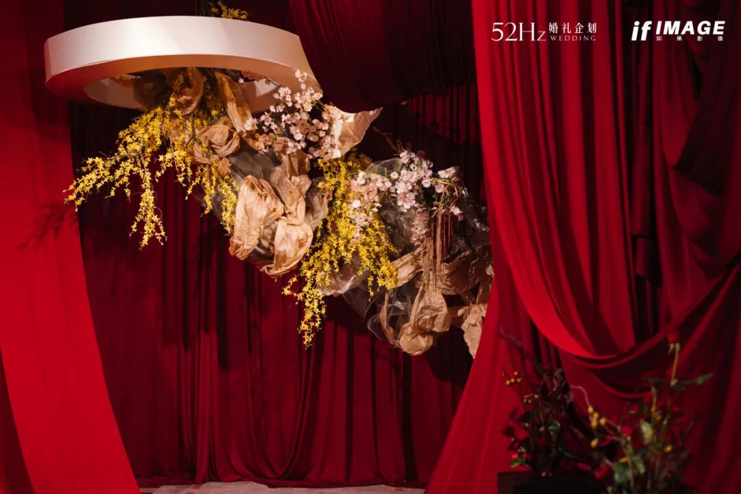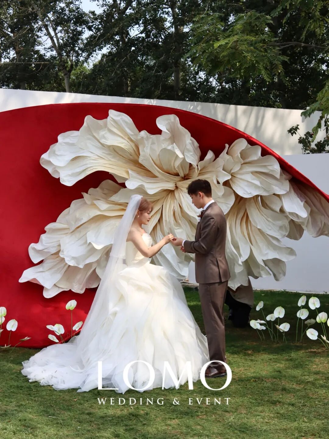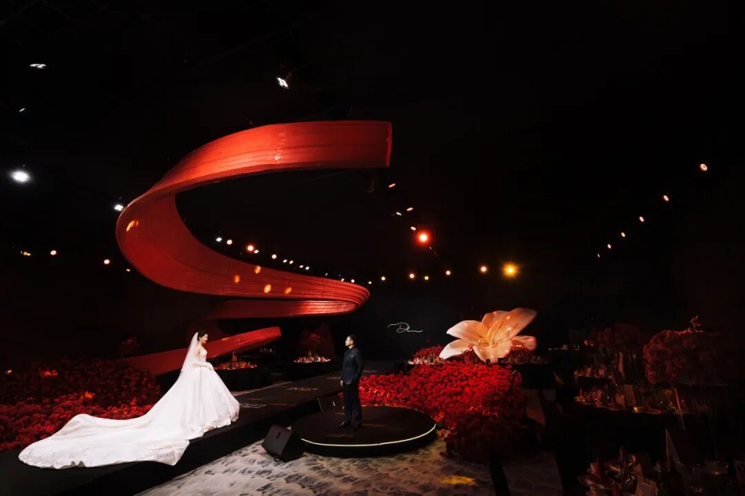仪式背景红色立体结构,悬浮的白色纸艺装置仿佛飘在云端,错落交织层叠出惊艳的视觉张力。炽热红与纯净白的碰撞,用色彩语言来叙述爱情浓烈又纯粹!