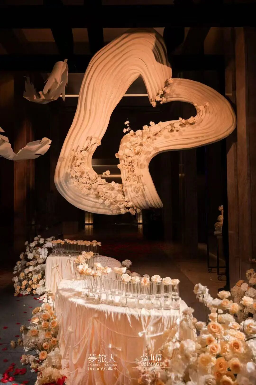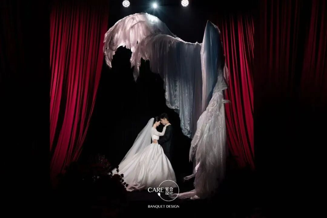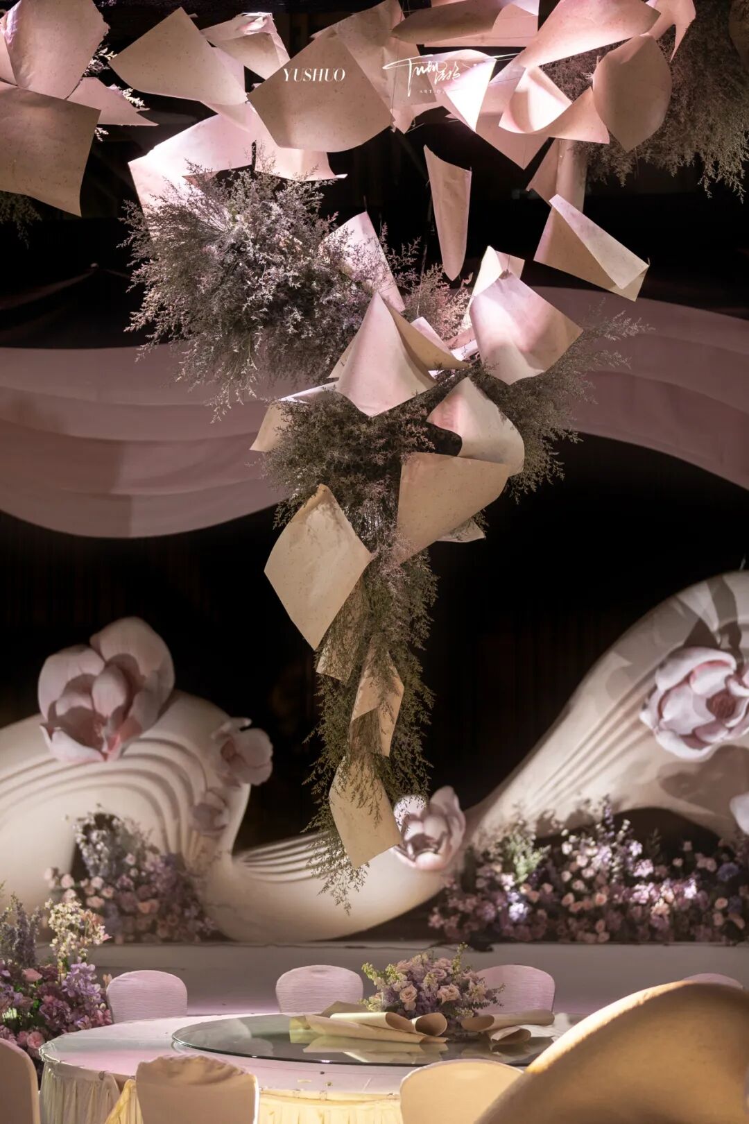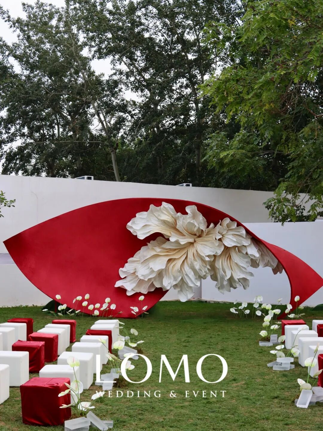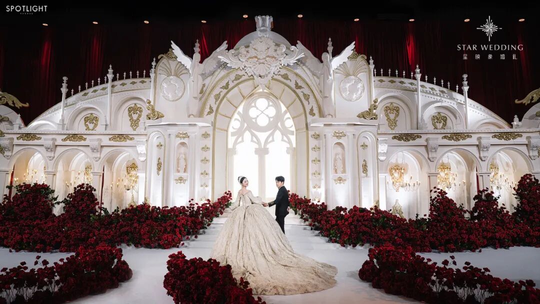 仪式背景红色立体结构,悬浮的白色纸艺装置仿佛飘在云端,错落交织层叠出惊艳的视觉张力。炽热红与纯净白的碰撞,用色彩语言来叙述爱情浓烈又纯粹!