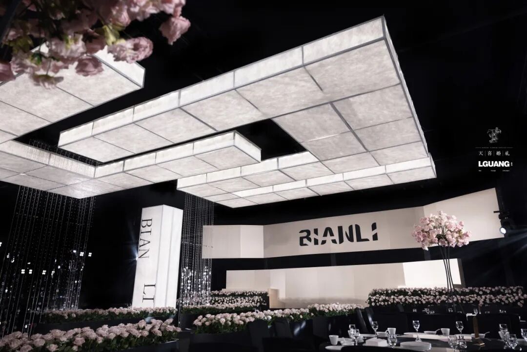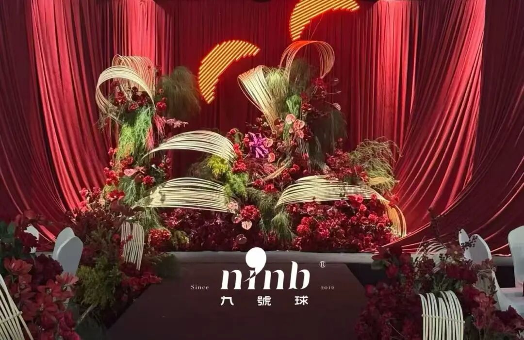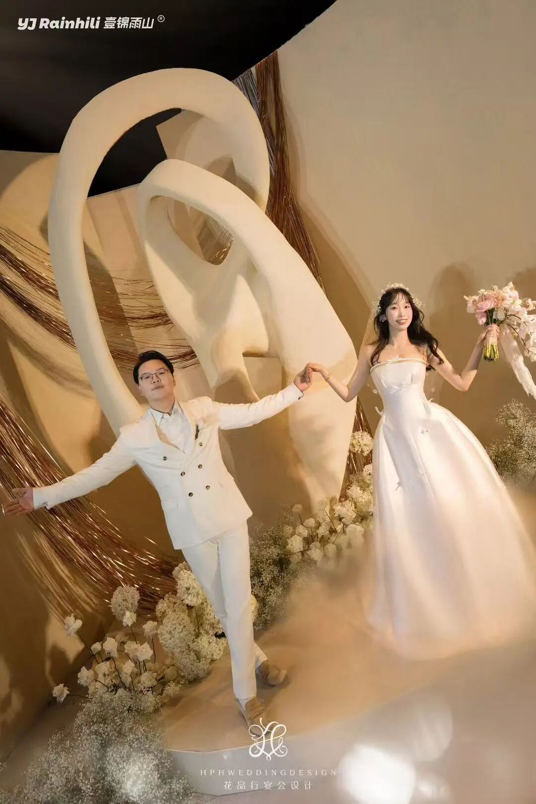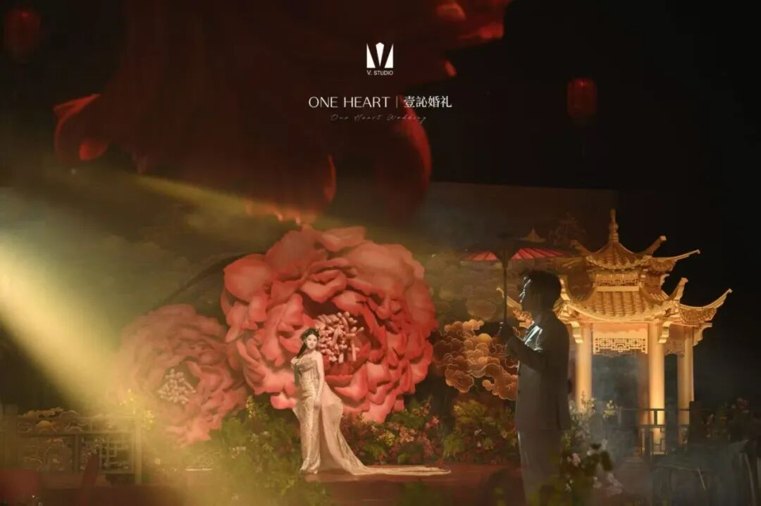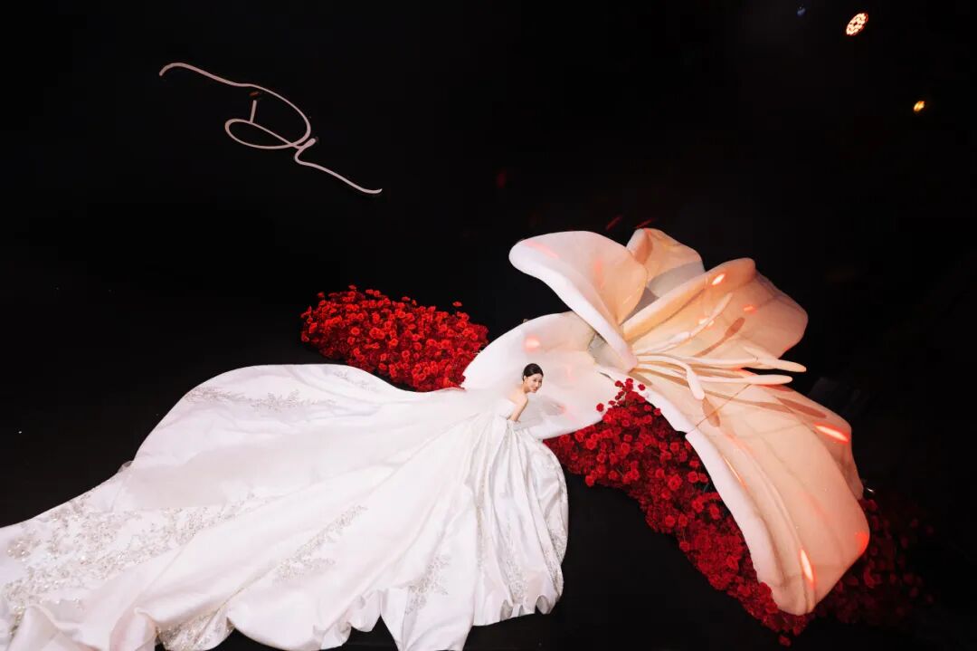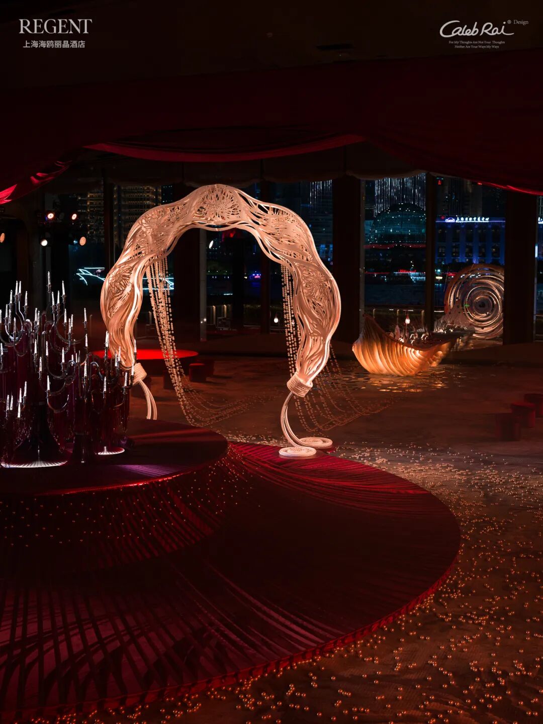 仪式背景红色立体结构,悬浮的白色纸艺装置仿佛飘在云端,错落交织层叠出惊艳的视觉张力。炽热红与纯净白的碰撞,用色彩语言来叙述爱情浓烈又纯粹!