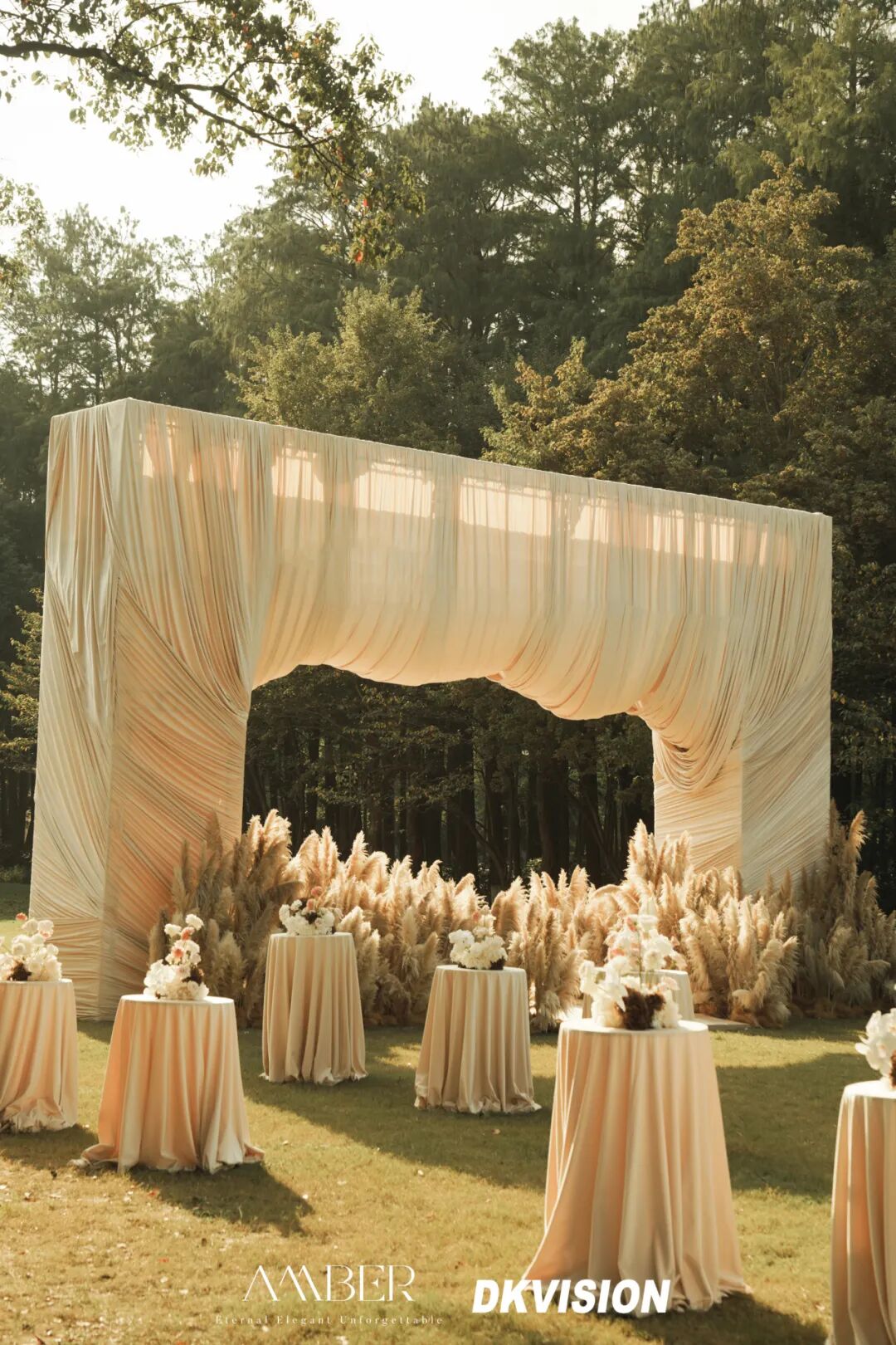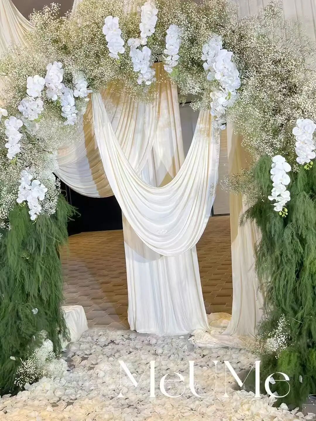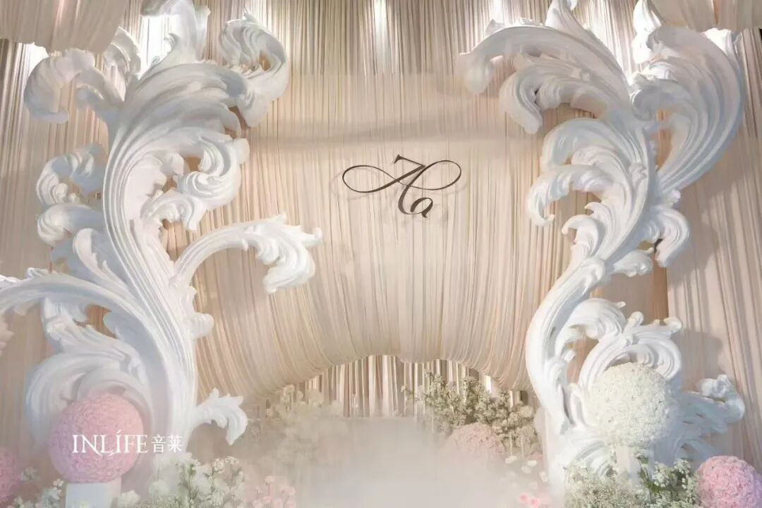 用蕾丝为笔,在自然的画布上勾勒。纯白蕾丝花纹雕琢的艺术装置,满天星堆叠起来的拱门,温柔的氛围感织就最浪漫的美学。
