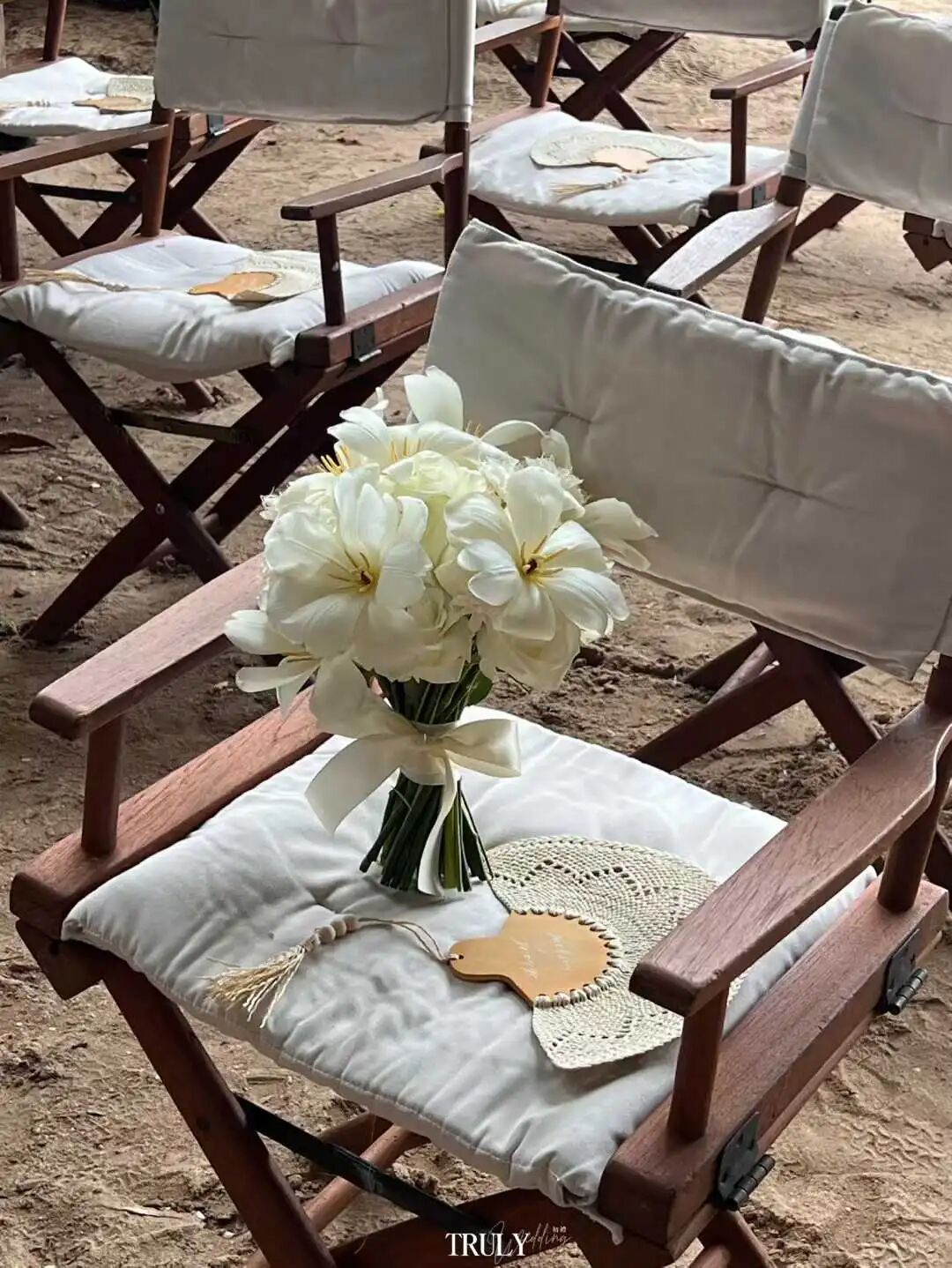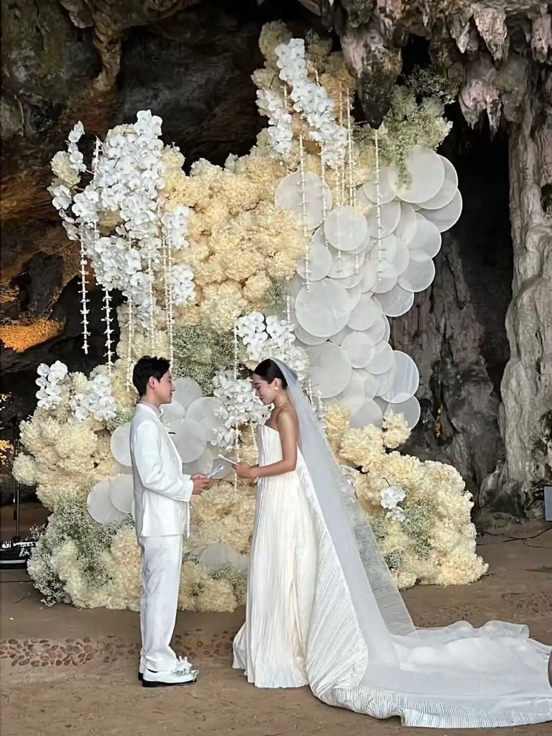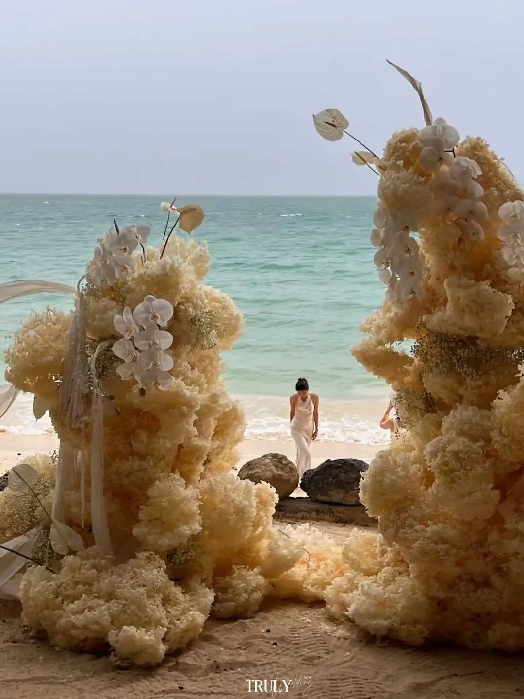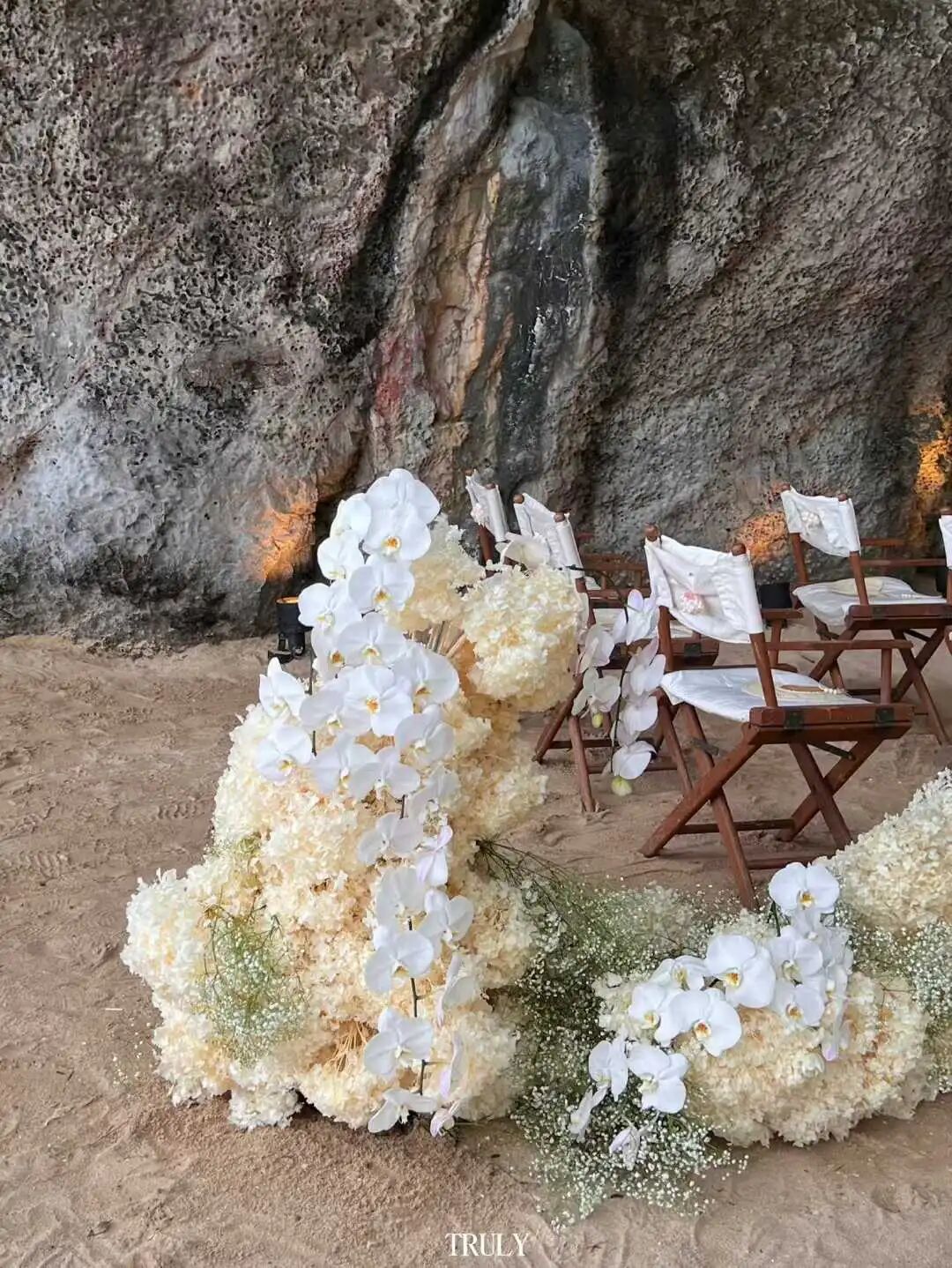 当古老洞穴遇上花艺的柔婉,这场婚礼把山海的浪漫揉进了每一处细节。奶油色花簇如珊瑚绽放于沙滩,白蝶兰似海浪轻吻岩壁,在自然的褶皱里,爱成了最诗意的装置艺术。
