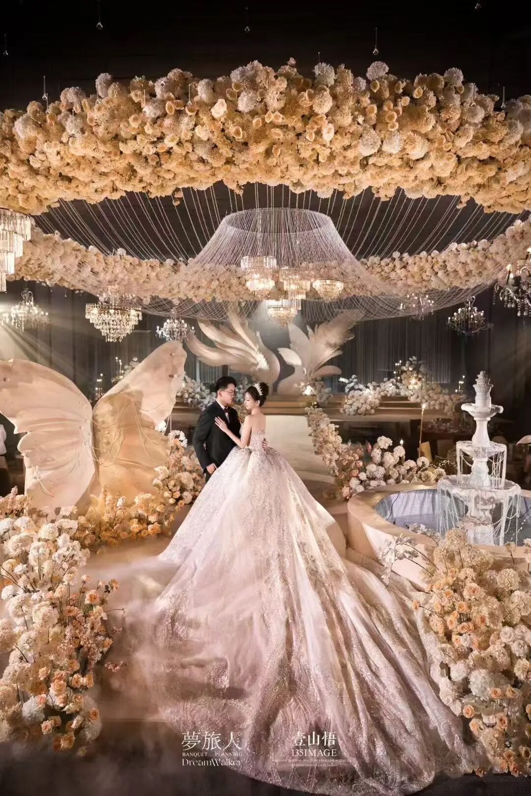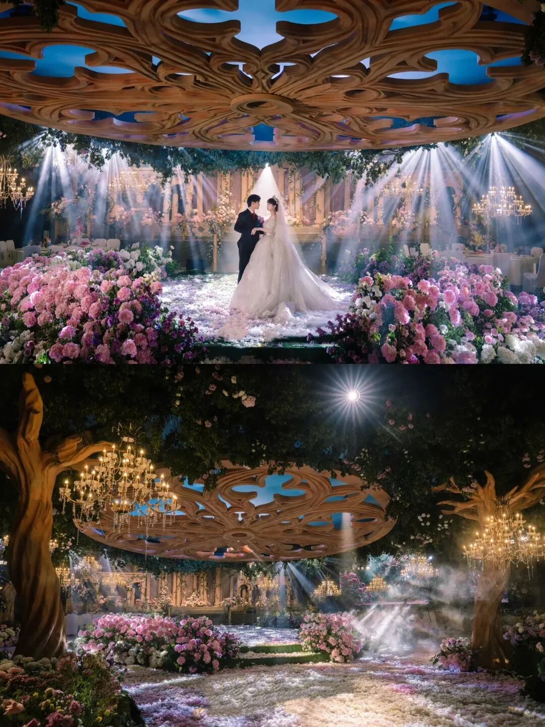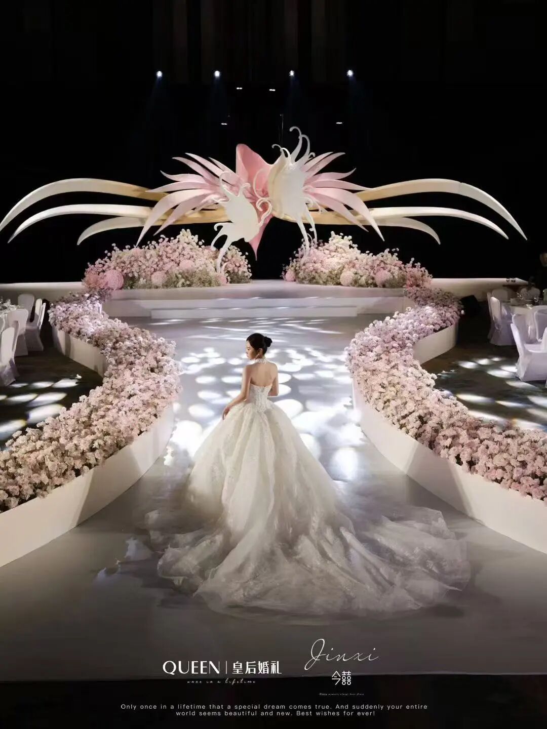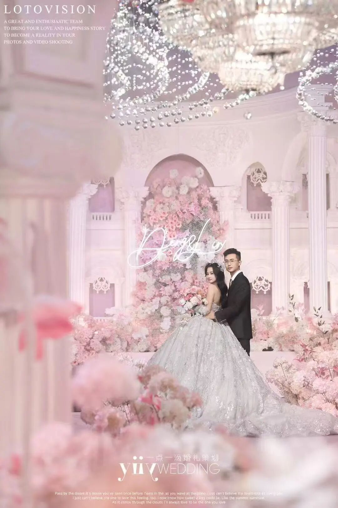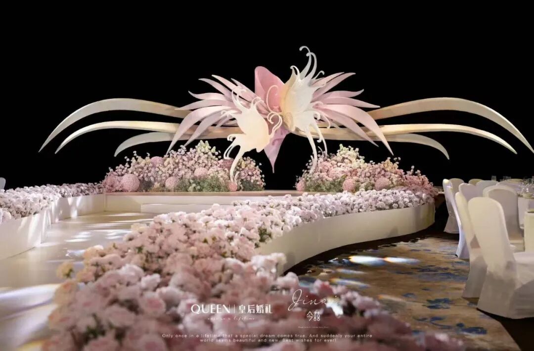 将浪漫的法式宫殿搬进婚礼,梦幻与高级在此交织。粉白花海层叠铺展,水晶灯垂落如雨,折射出柔光流影。翩翩蝴蝶,掠过花间,让梦境的轮廓有了温度与呼吸感。新娘走过花瓣铺成的云端,裙摆晕染整场光影,仿佛坠入一幅粉色油画柔雾灯光下,空气都变得温柔。