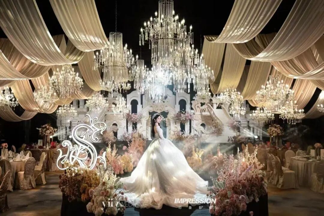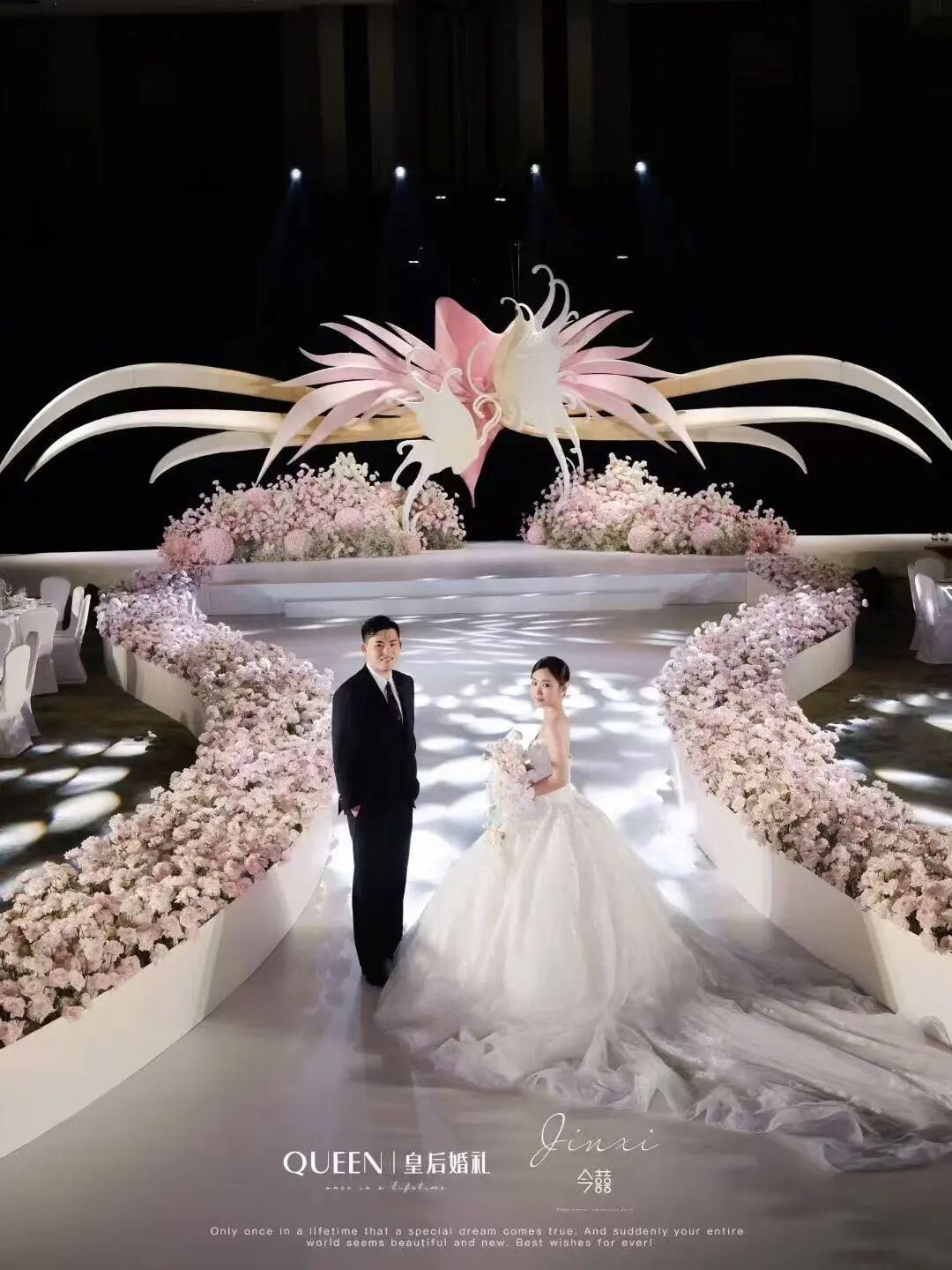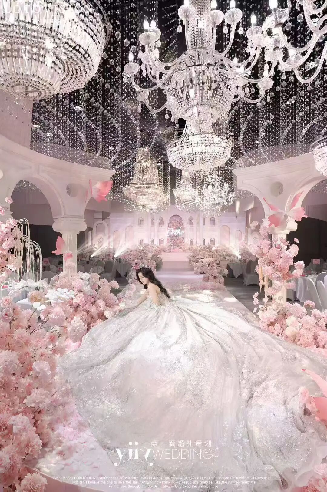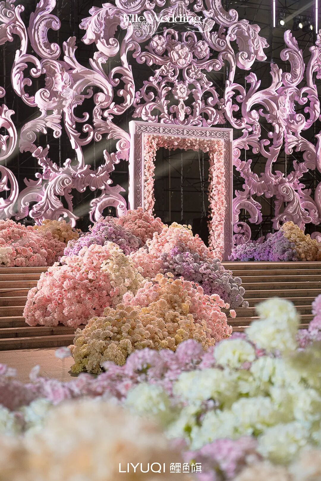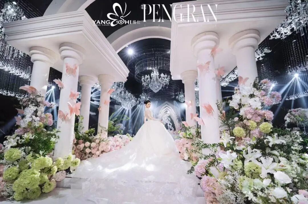 将浪漫的法式宫殿搬进婚礼,梦幻与高级在此交织。粉白花海层叠铺展,水晶灯垂落如雨,折射出柔光流影。翩翩蝴蝶,掠过花间,让梦境的轮廓有了温度与呼吸感。新娘走过花瓣铺成的云端,裙摆晕染整场光影,仿佛坠入一幅粉色油画柔雾灯光下,空气都变得温柔。