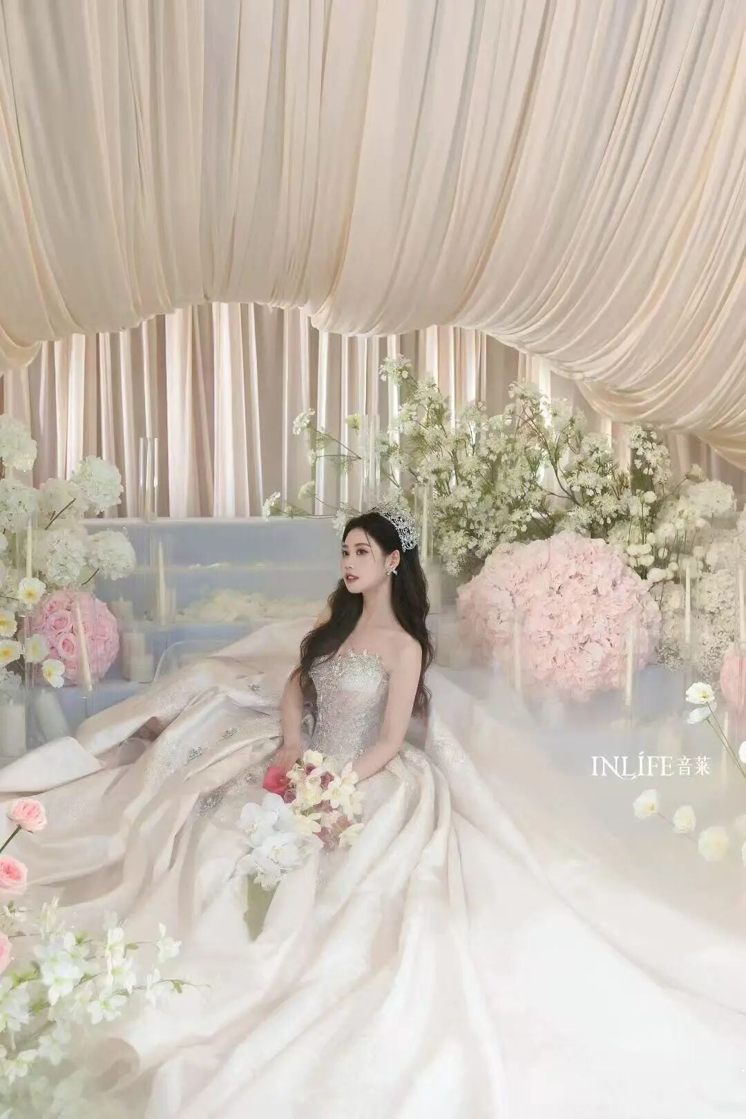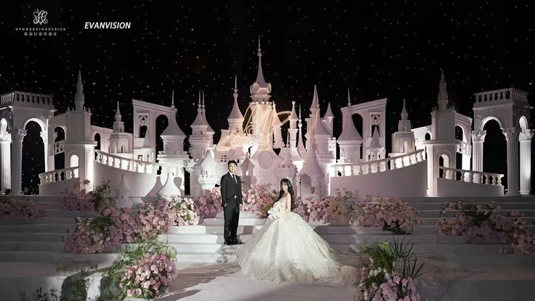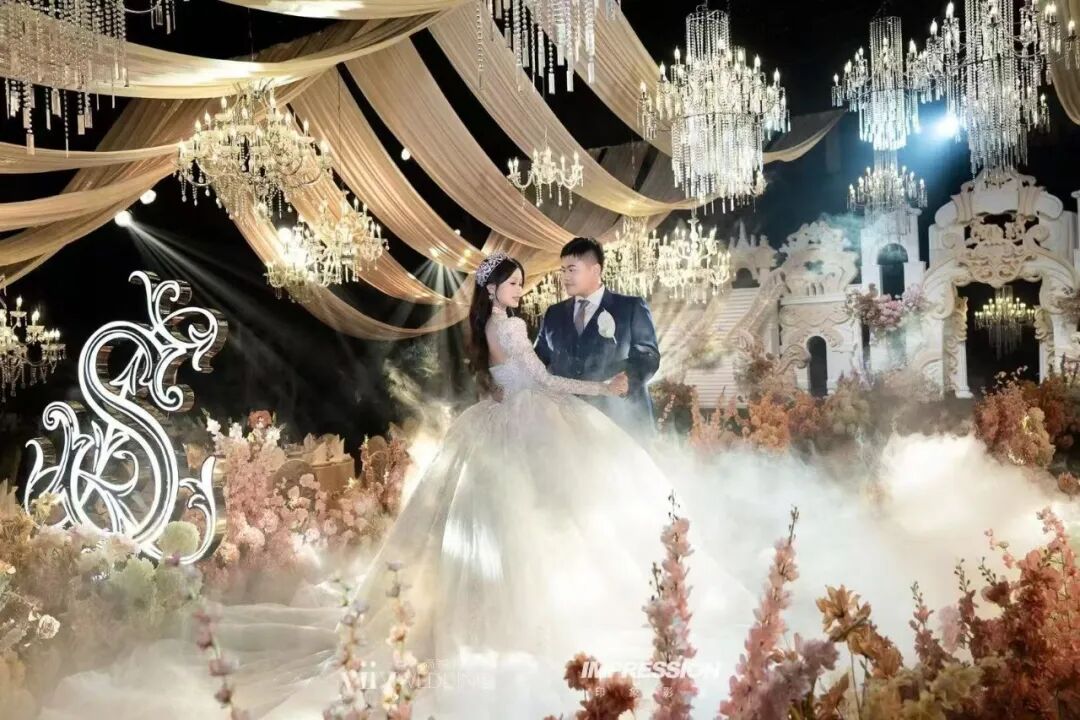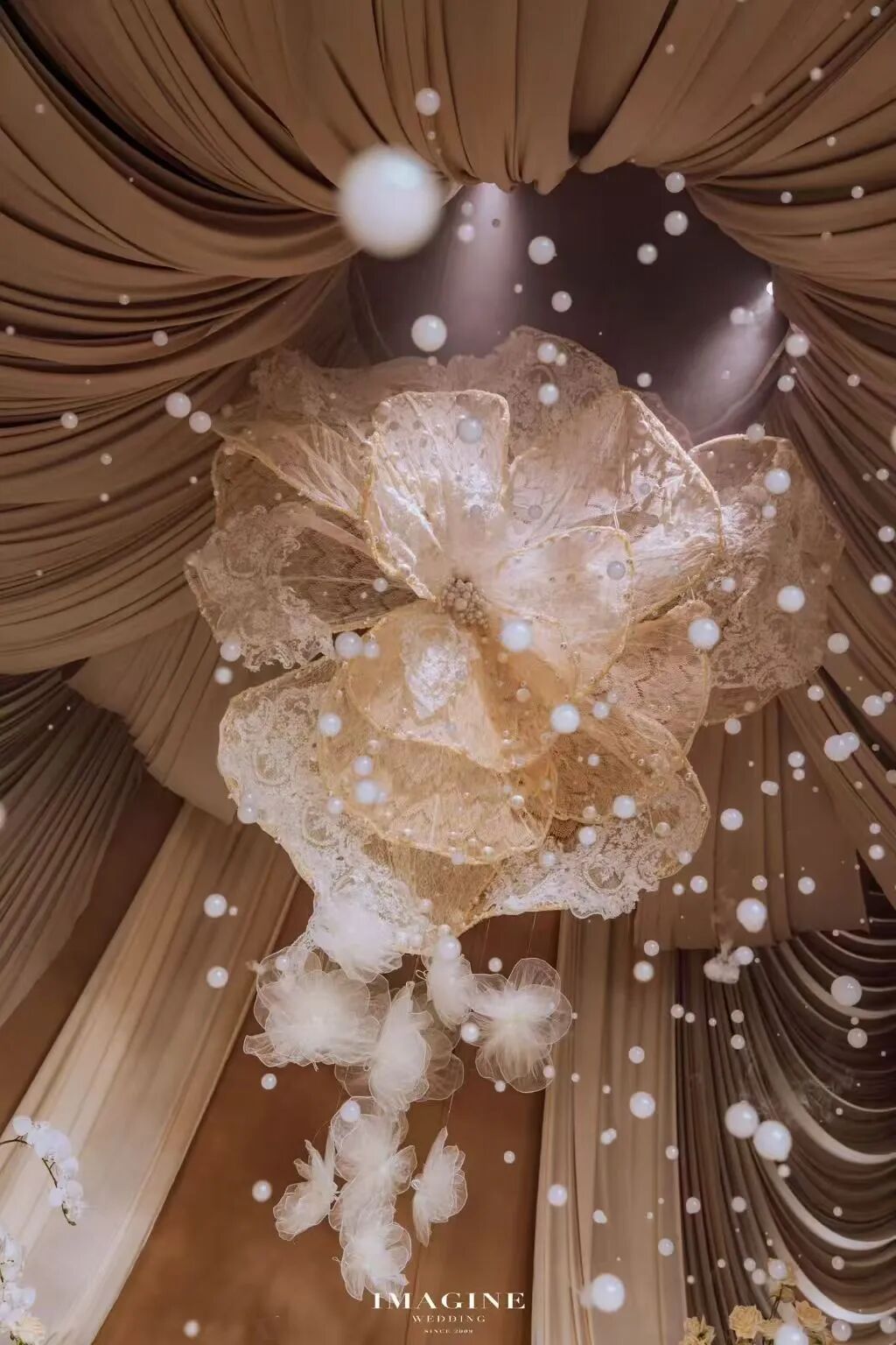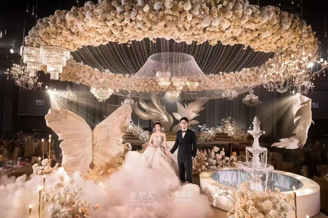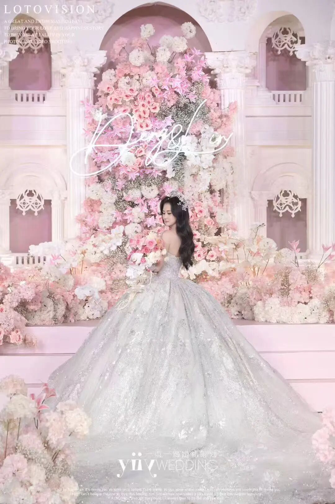 将浪漫的法式宫殿搬进婚礼,梦幻与高级在此交织。粉白花海层叠铺展,水晶灯垂落如雨,折射出柔光流影。翩翩蝴蝶,掠过花间,让梦境的轮廓有了温度与呼吸感。新娘走过花瓣铺成的云端,裙摆晕染整场光影,仿佛坠入一幅粉色油画柔雾灯光下,空气都变得温柔。