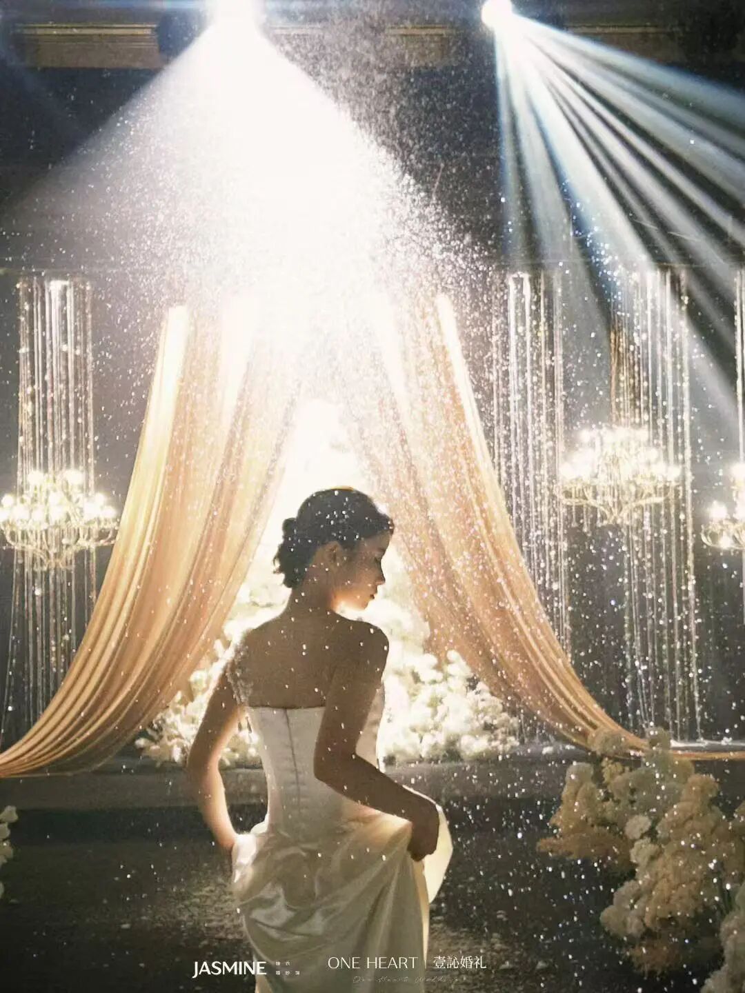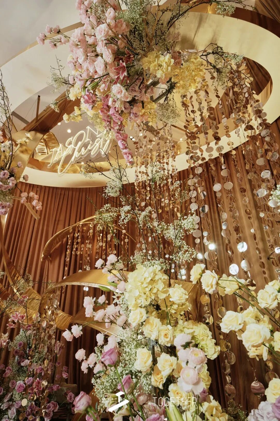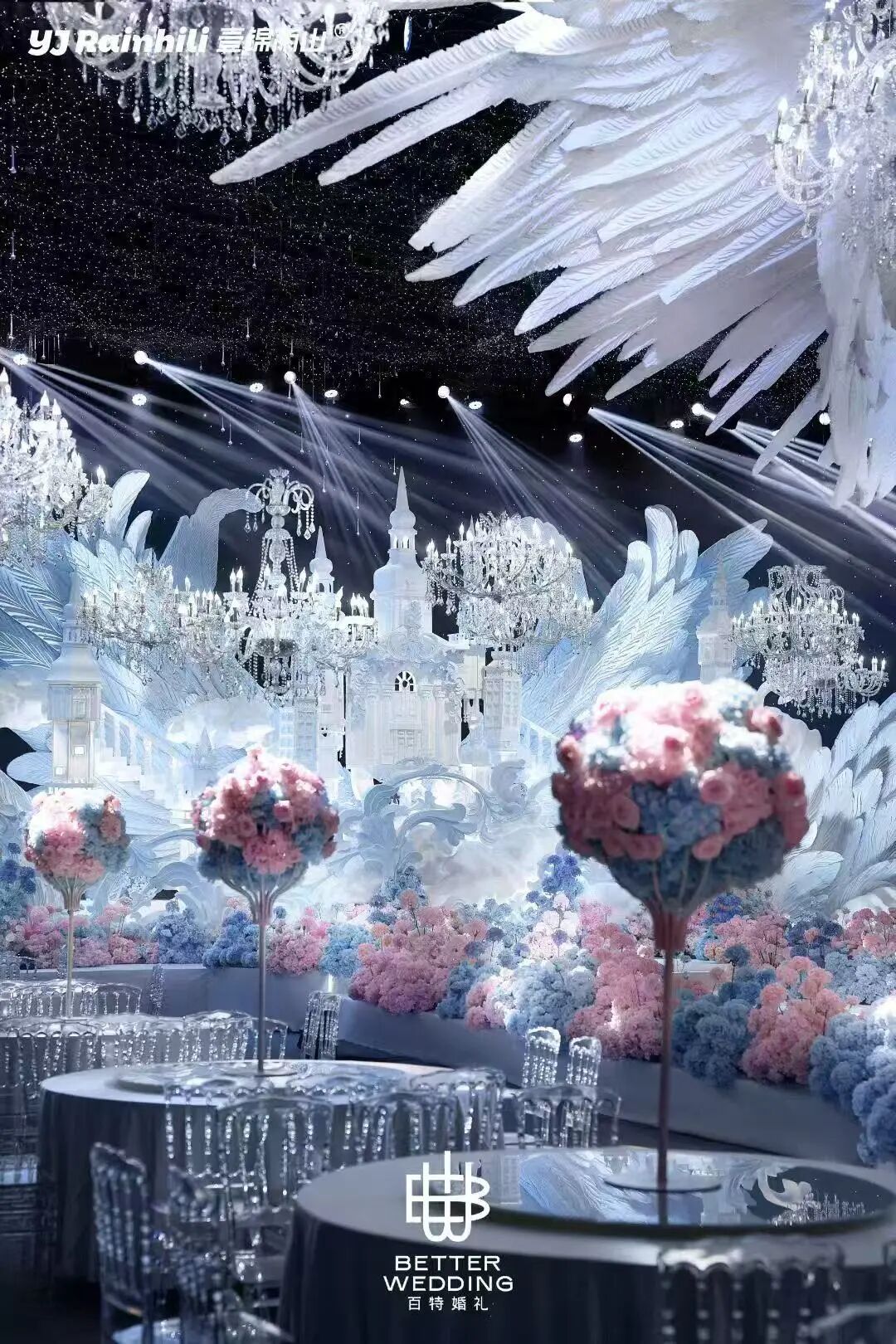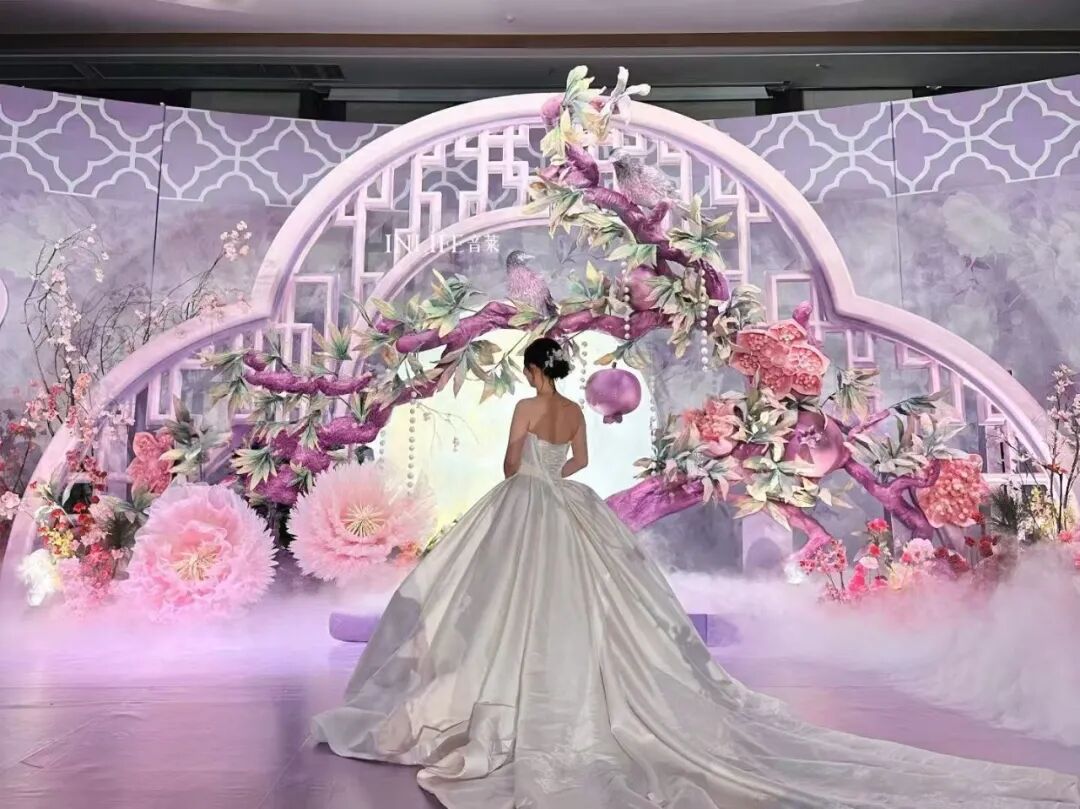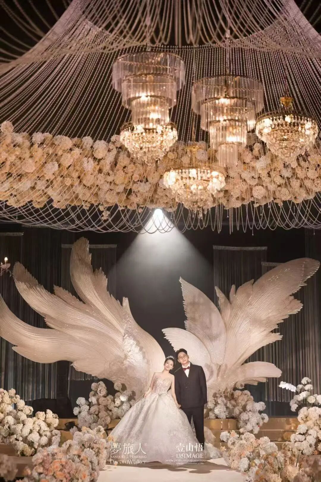 将浪漫的法式宫殿搬进婚礼,梦幻与高级在此交织。粉白花海层叠铺展,水晶灯垂落如雨,折射出柔光流影。翩翩蝴蝶,掠过花间,让梦境的轮廓有了温度与呼吸感。新娘走过花瓣铺成的云端,裙摆晕染整场光影,仿佛坠入一幅粉色油画柔雾灯光下,空气都变得温柔。