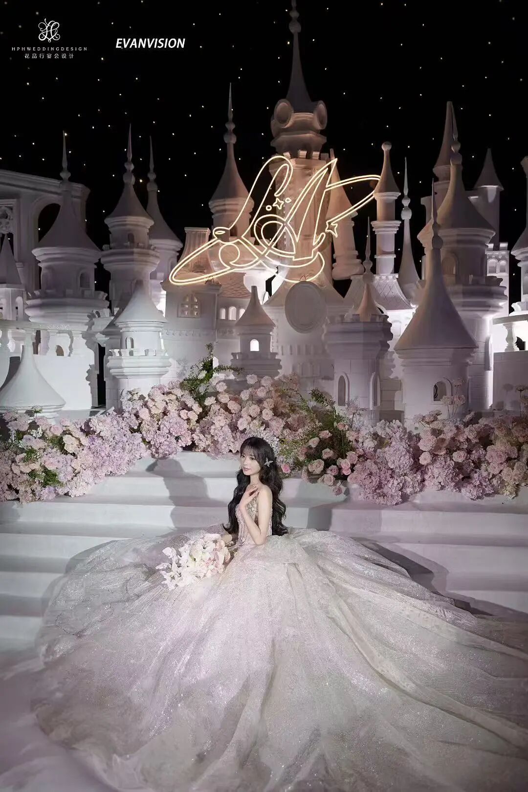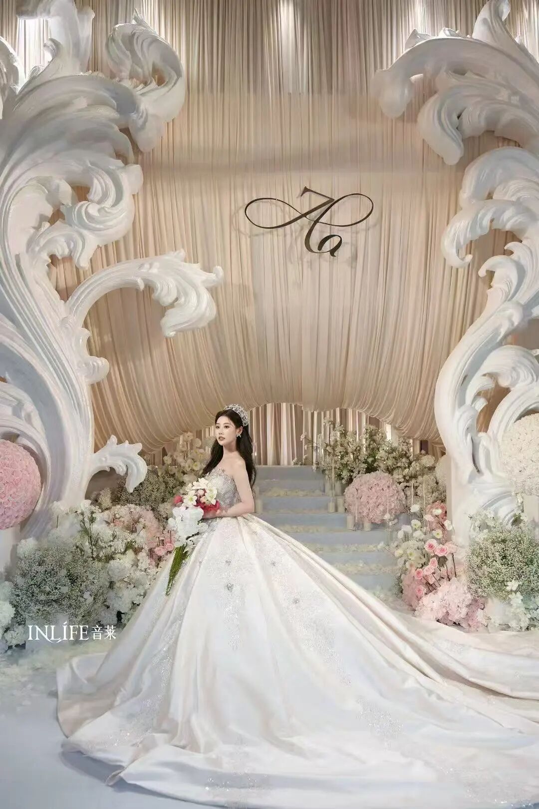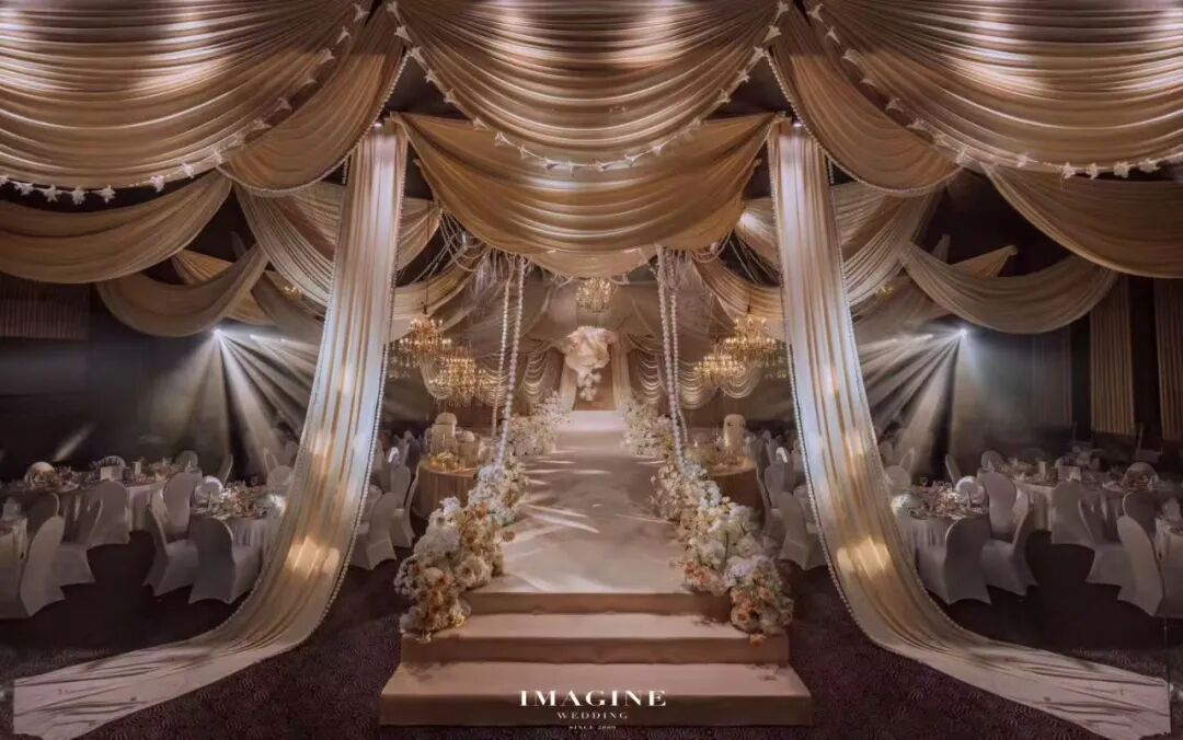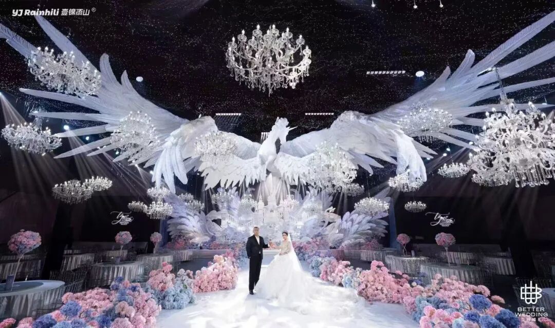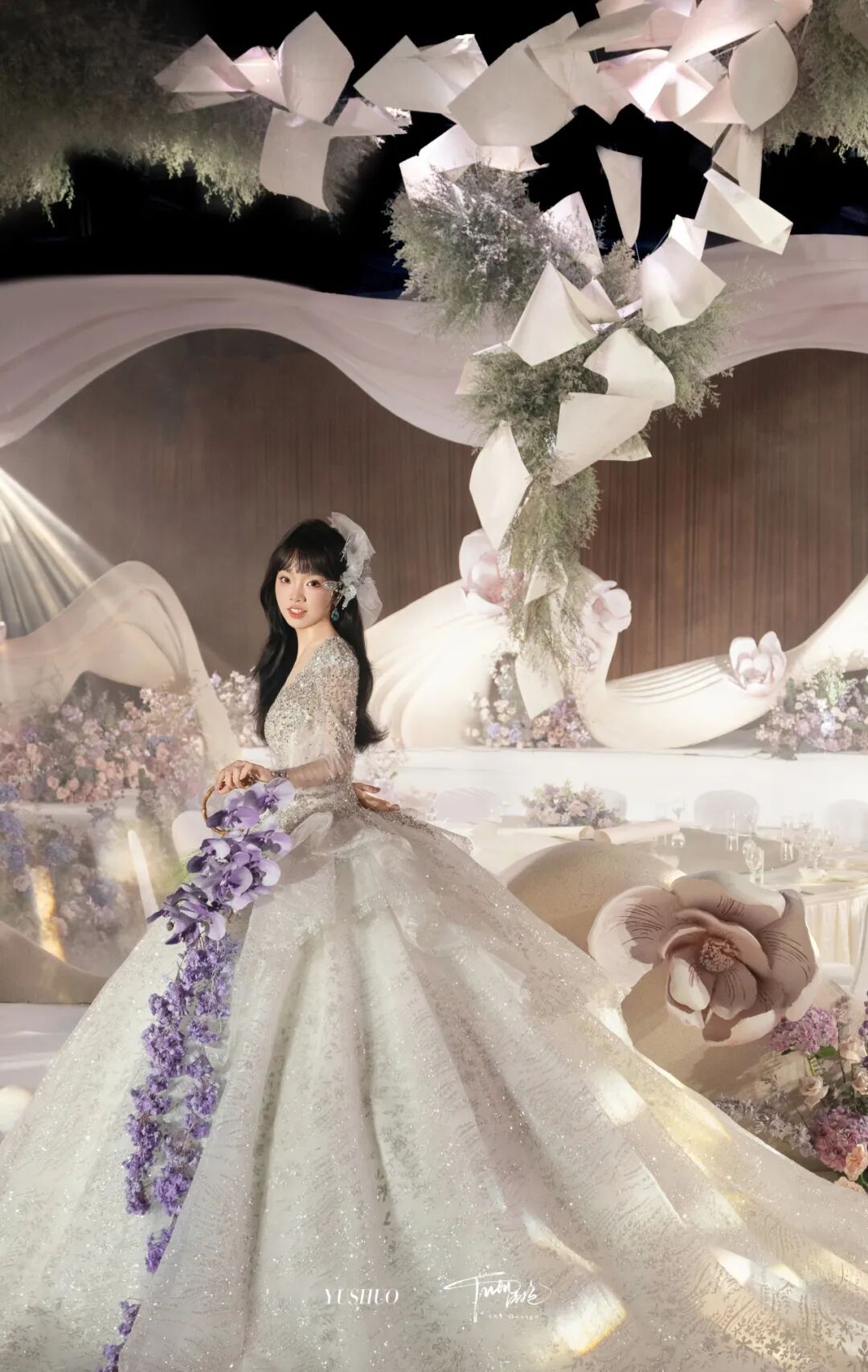 将浪漫的法式宫殿搬进婚礼,梦幻与高级在此交织。粉白花海层叠铺展,水晶灯垂落如雨,折射出柔光流影。翩翩蝴蝶,掠过花间,让梦境的轮廓有了温度与呼吸感。新娘走过花瓣铺成的云端,裙摆晕染整场光影,仿佛坠入一幅粉色油画柔雾灯光下,空气都变得温柔。