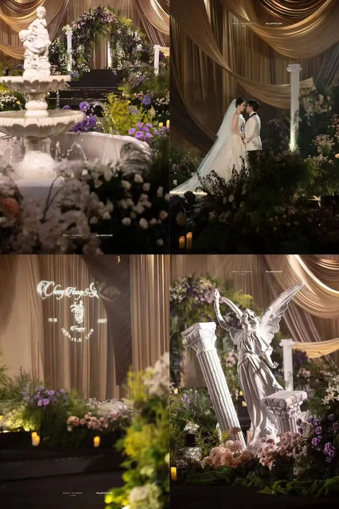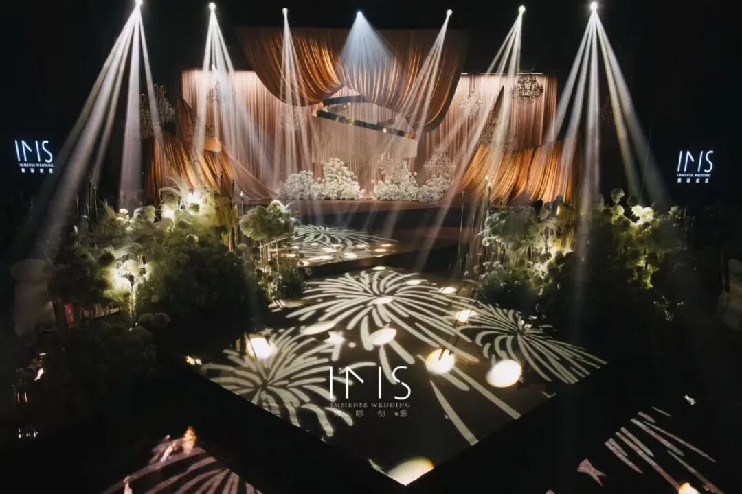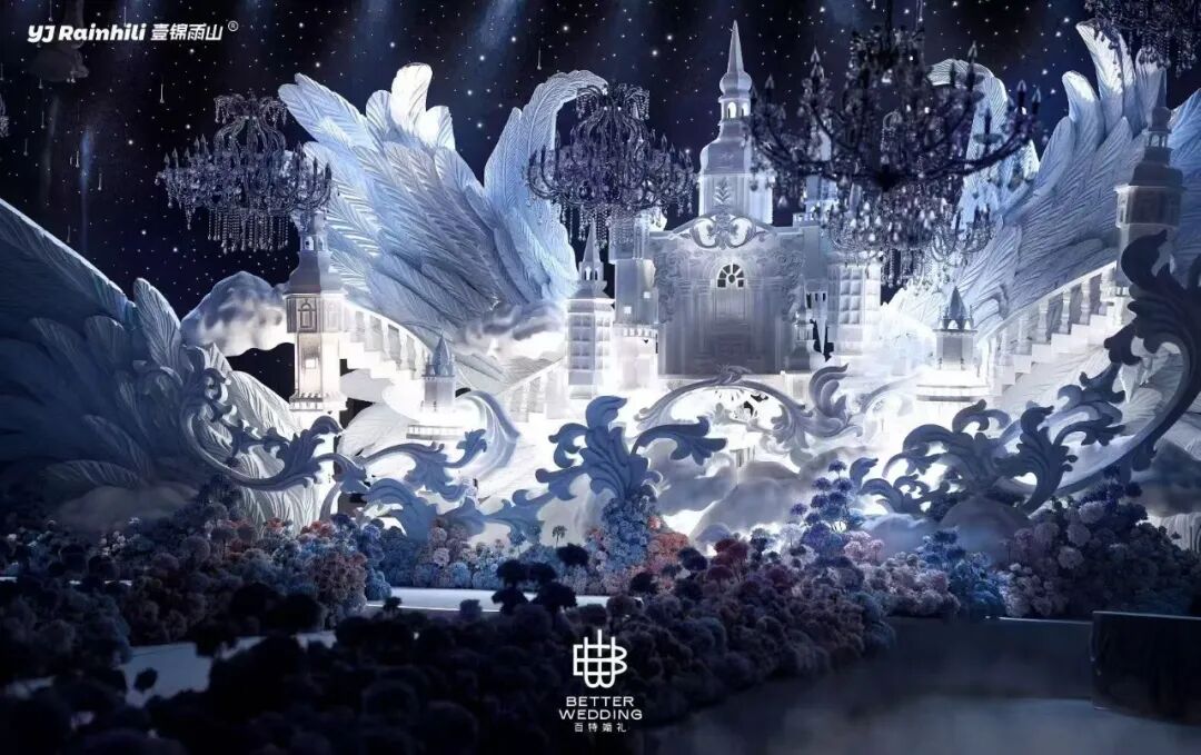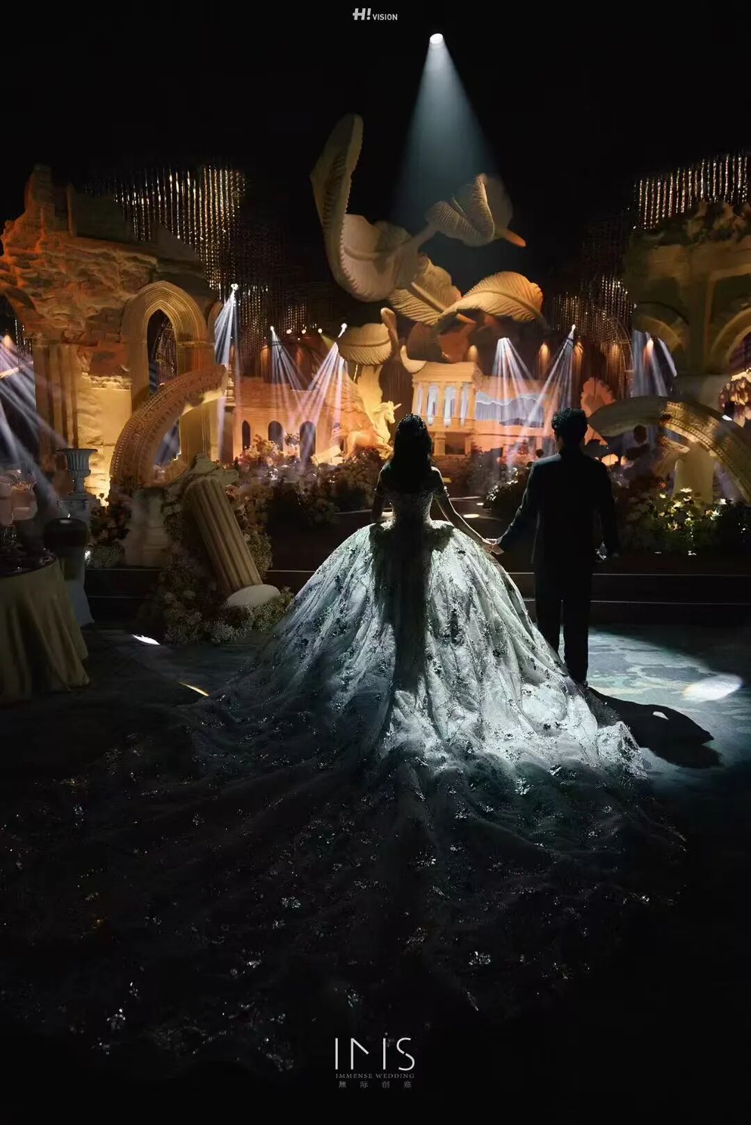 极繁主义婚礼的又一种呈现,结合老钱色调,顶上的绚烂烟花结合地面的泡雕建筑,一切都是如此相得益彰。