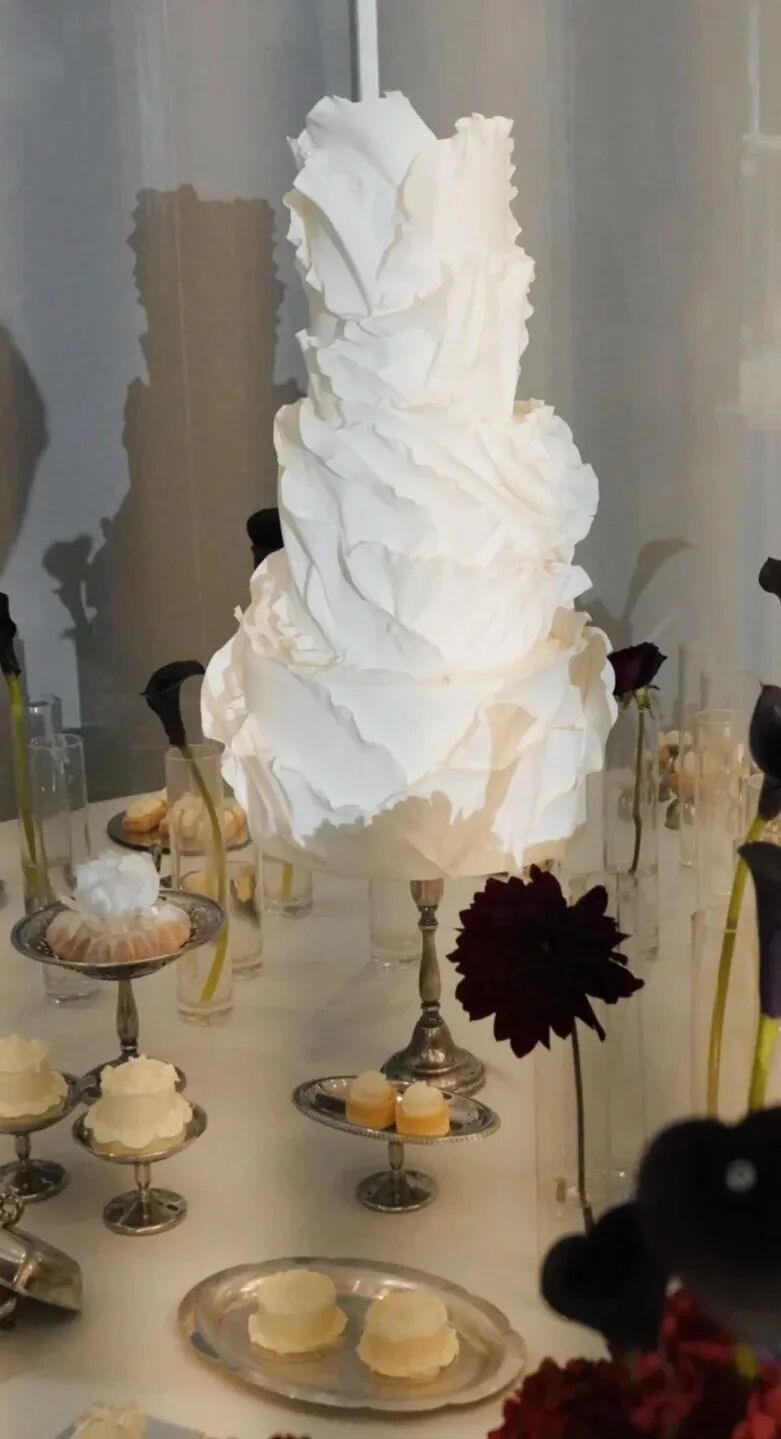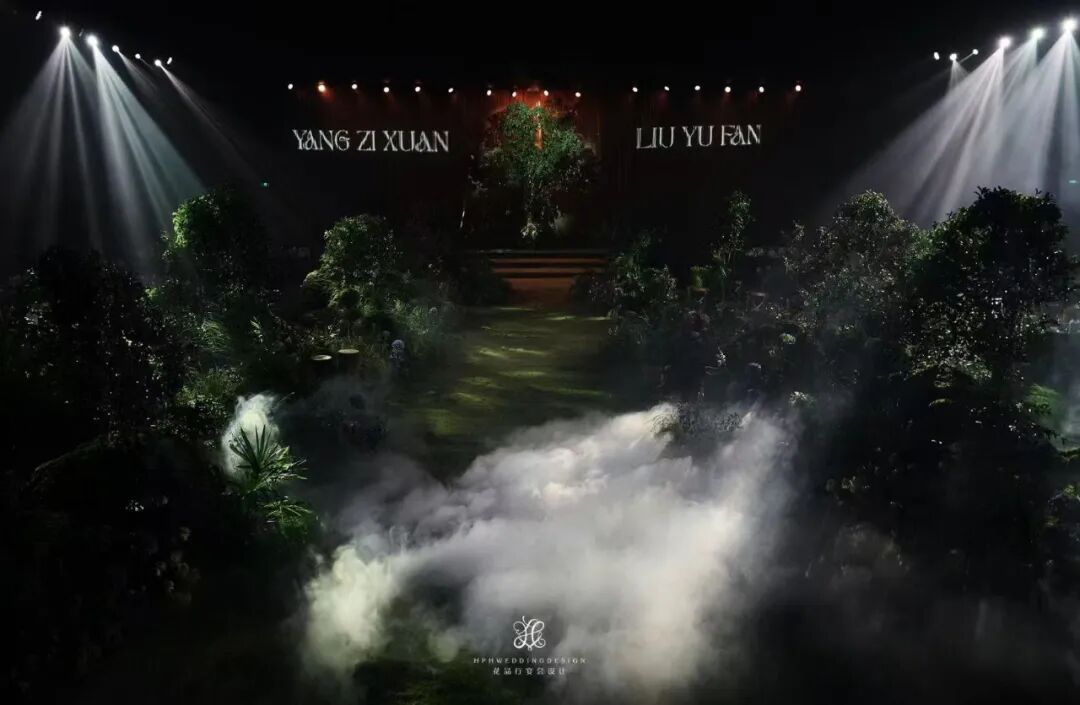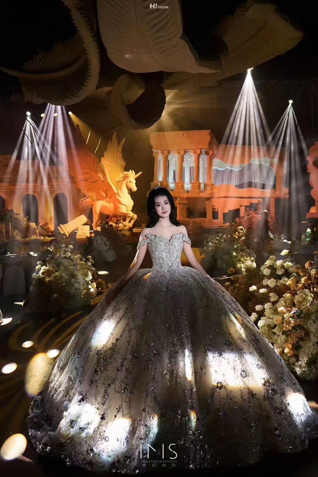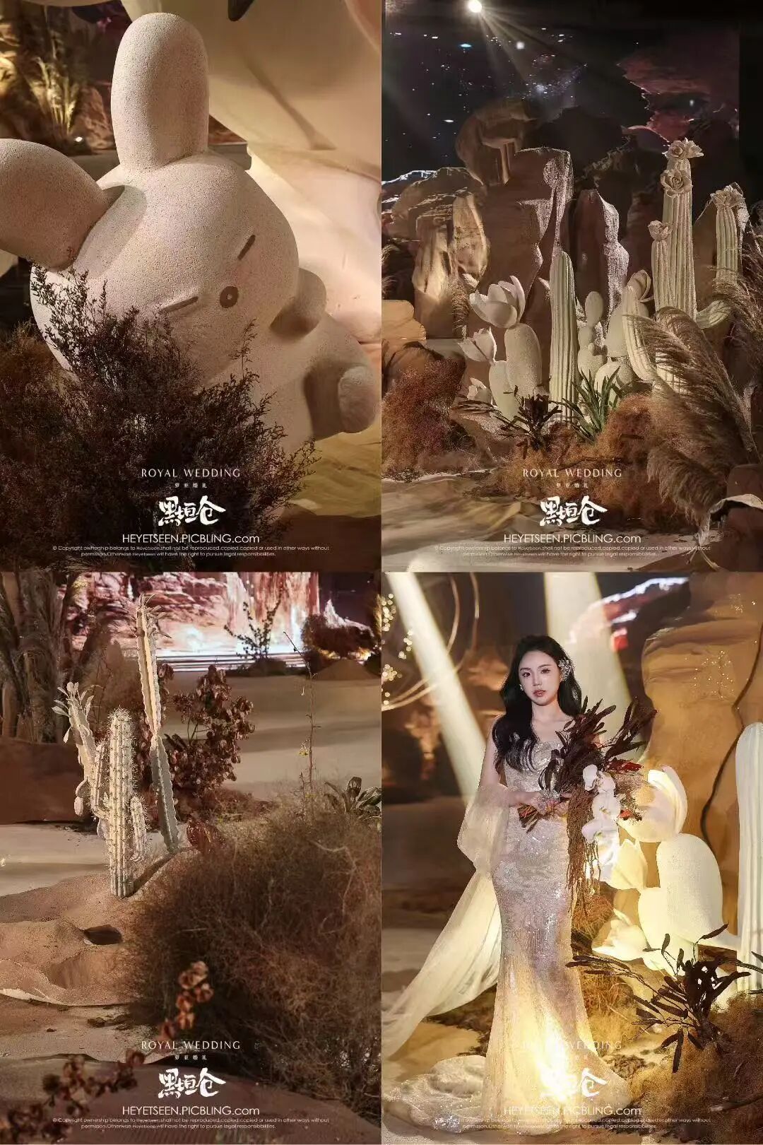 极繁主义婚礼的又一种呈现,结合老钱色调,顶上的绚烂烟花结合地面的泡雕建筑,一切都是如此相得益彰。