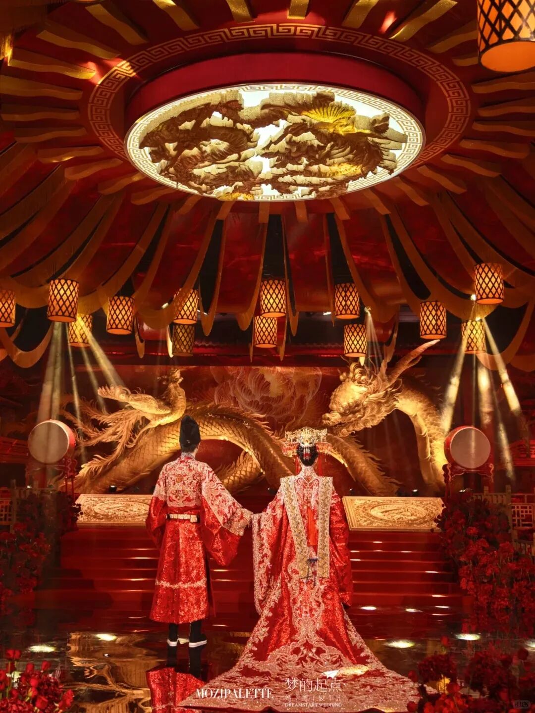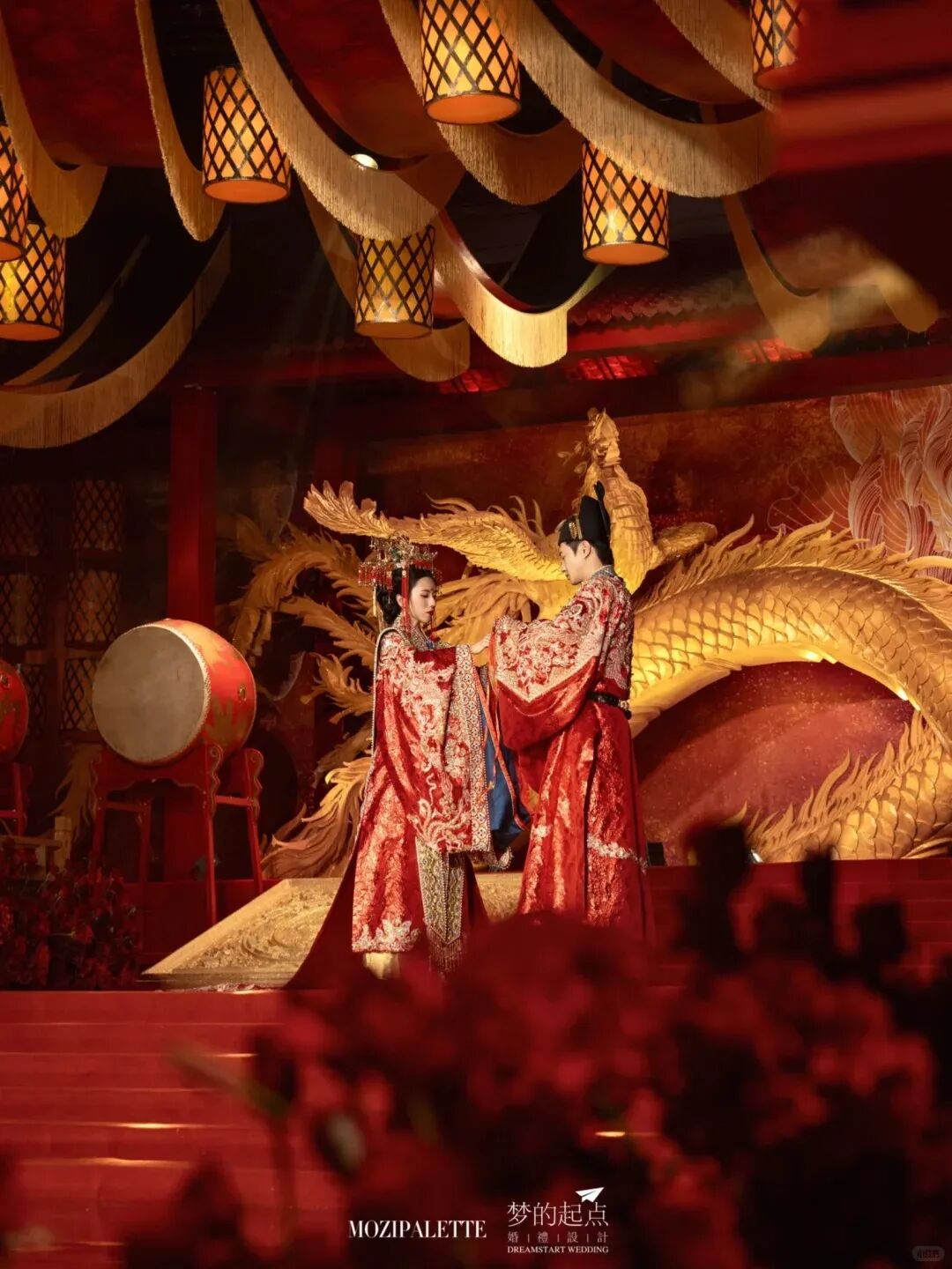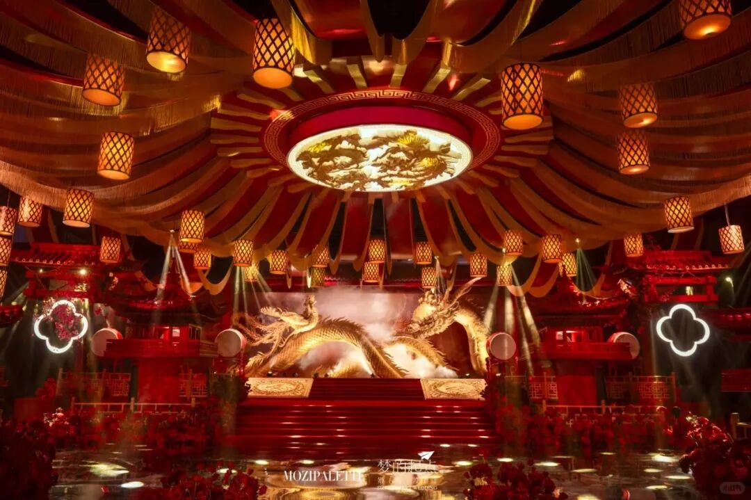 主舞台的瞬间真的被震撼到,巨龙盘旋,凤凰展翅的巨型装置太霸气了。每一片鳞羽都在灯光下闪着鎏金光晕,仿佛穿越千年见证帝王大婚的华章。