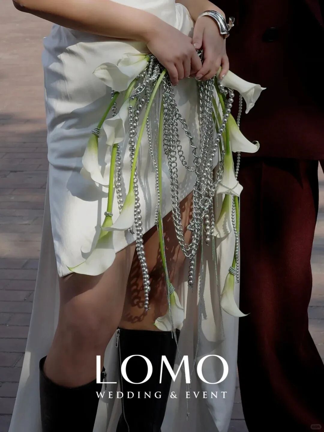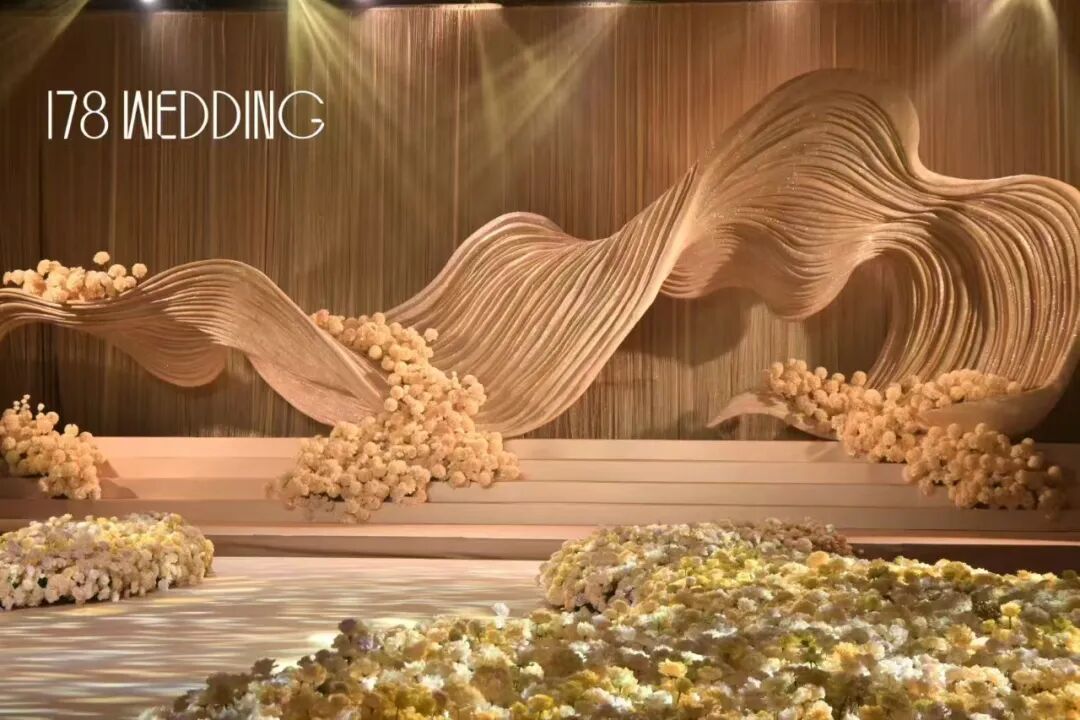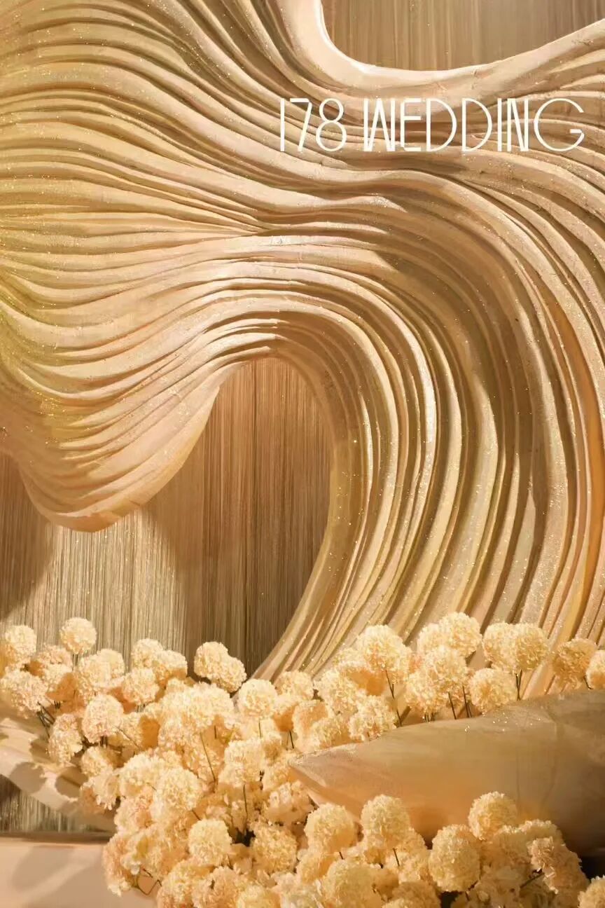 金属质感的艺术装置婚礼,每一帧都高级到不行!新人认为婚姻像共同养育的盆栽,定期修剪但不束缚成长方向,两个人都能舒服的做自己。所以主背景是金属感的不规整、简约灵动的银色曲线艺术装置。