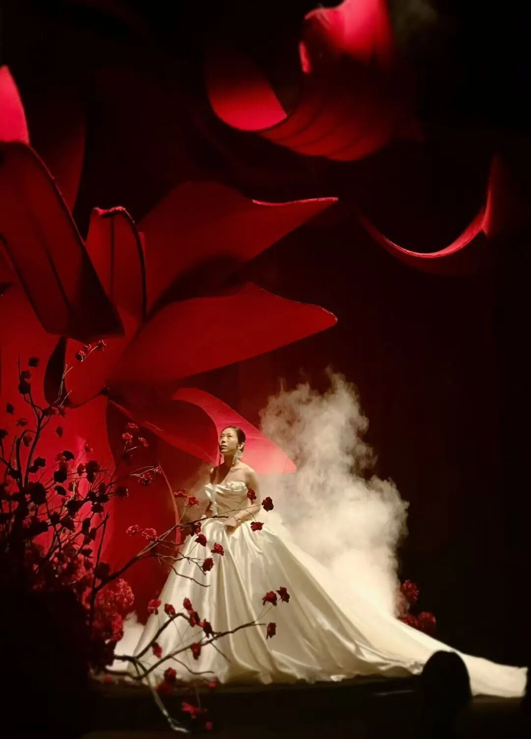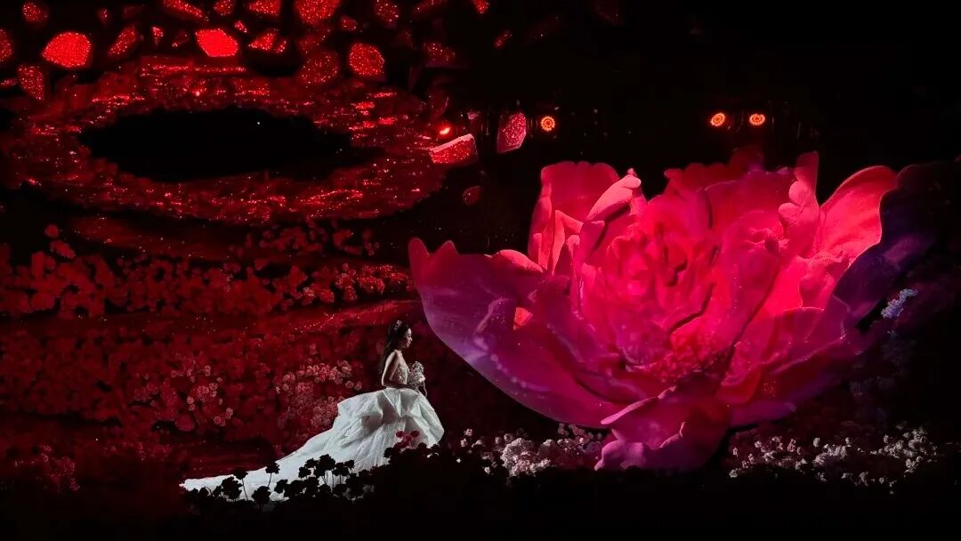 巨型百合装置伫立在红墙前,花瓣的质感细腻到犯规,红玫瑰瀑布从两侧蔓延开来,每一朵都像为爱情而燃的火焰