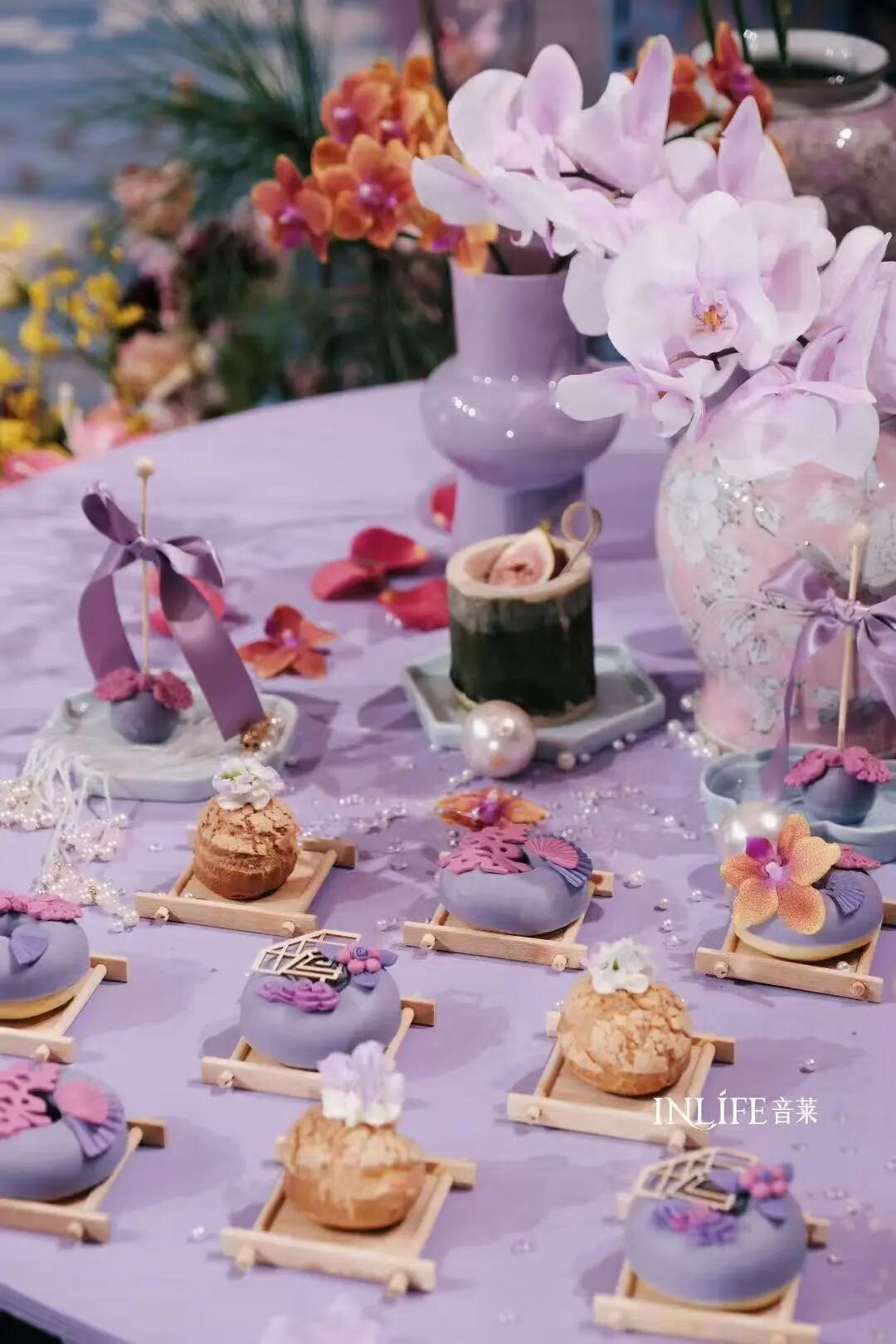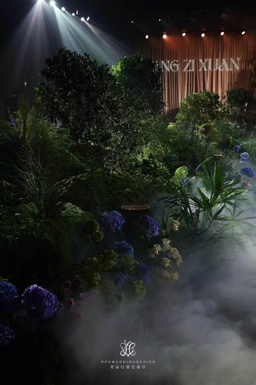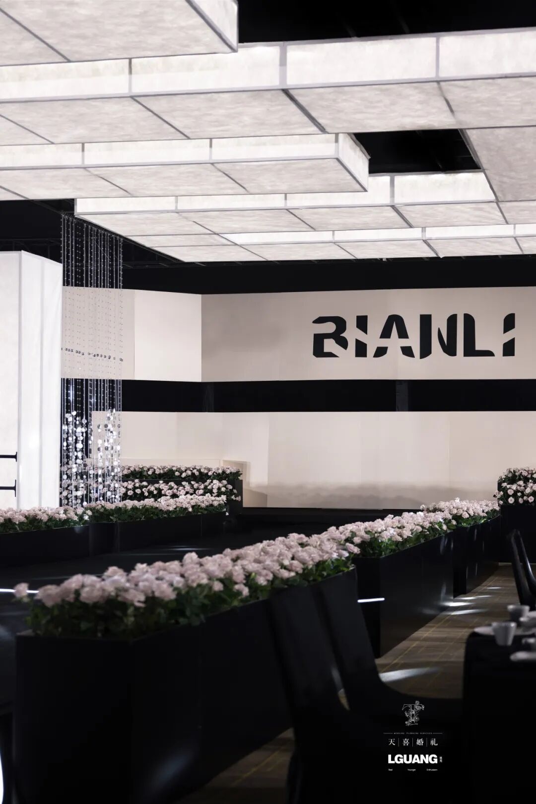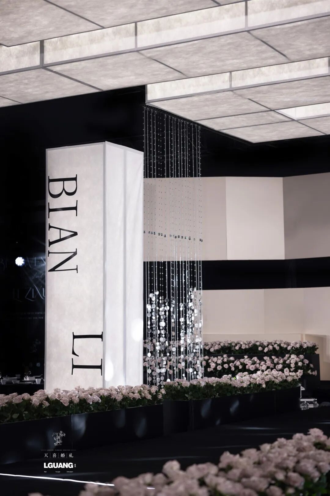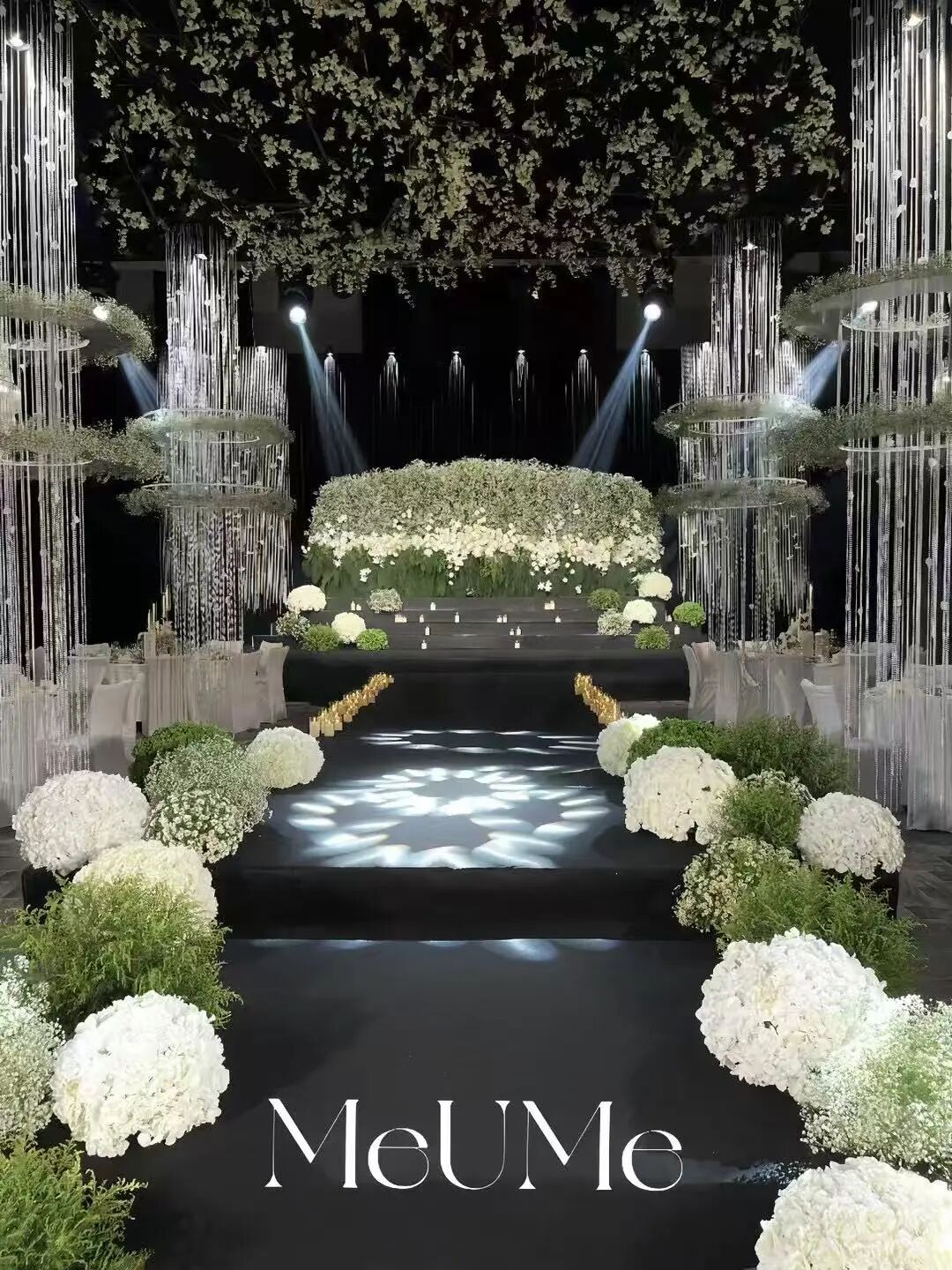 干干净净的白绿色系与银色T台,搭配规整排列的花艺馥郁绽放,有着时尚秀场般的高级感。