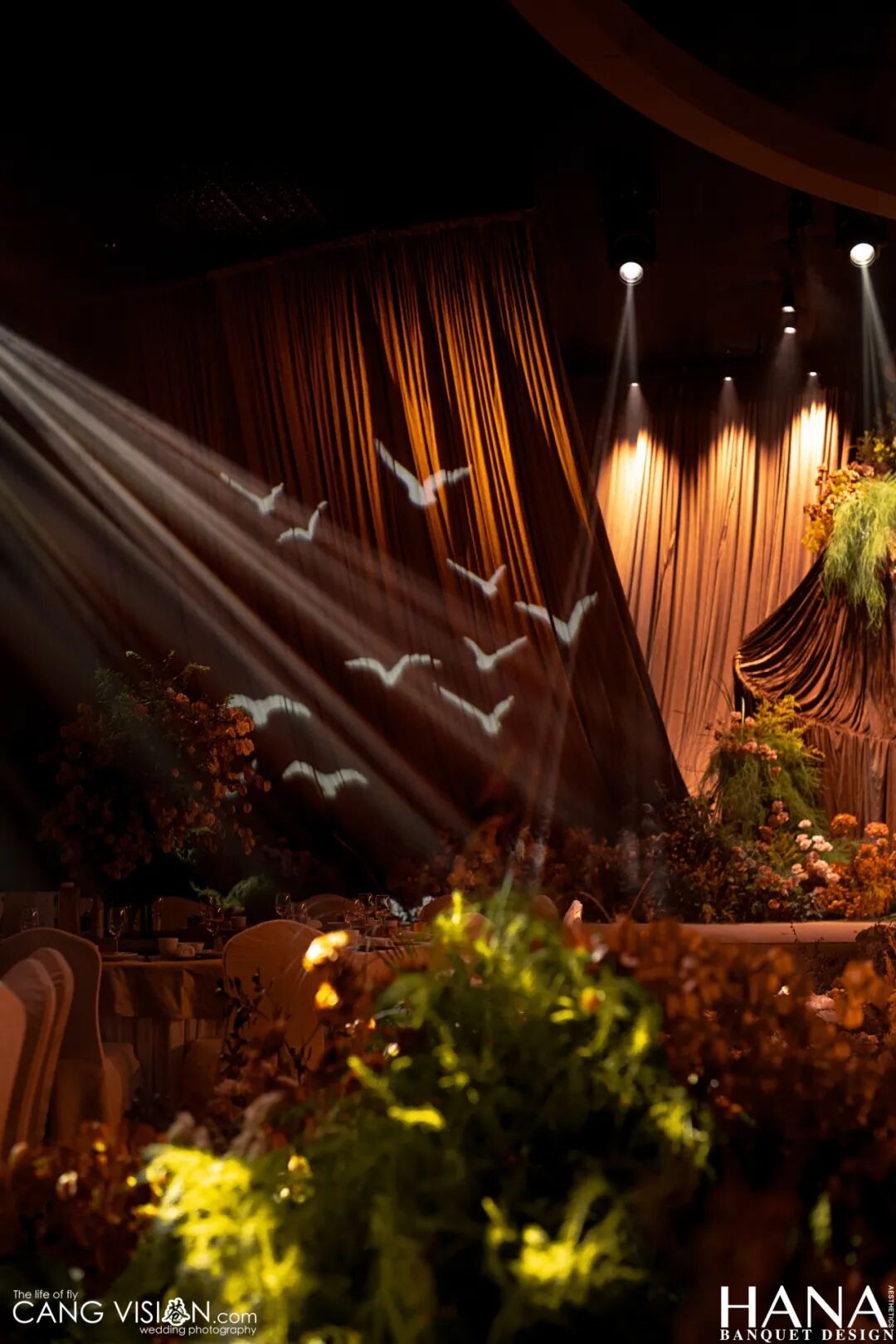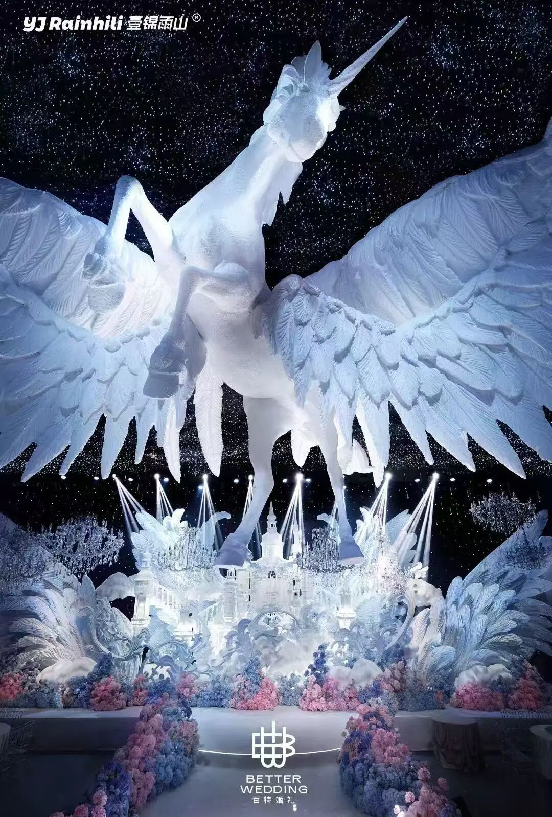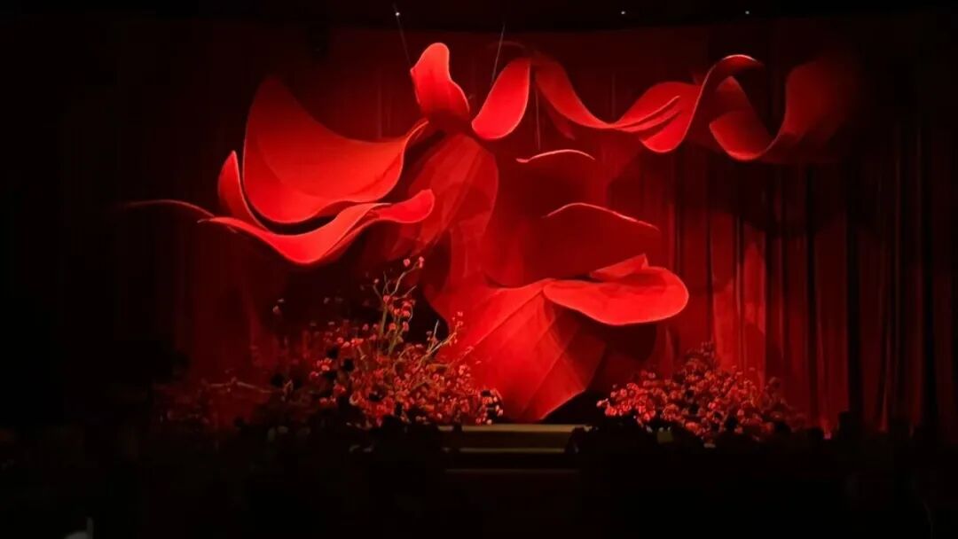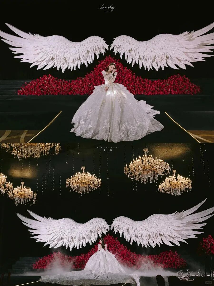 翼展18米,直接撑满整个舞台背景,视觉冲击力拉满。巨物进入宴会厅,都由手工调整角度,无论从哪个座位看,都是完美的。