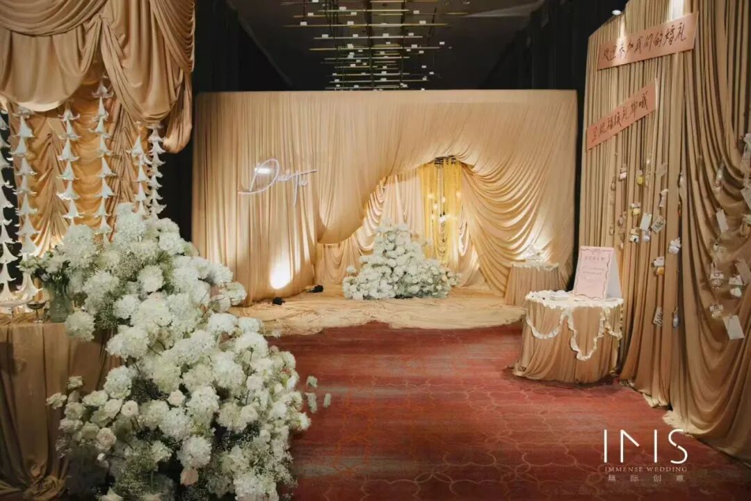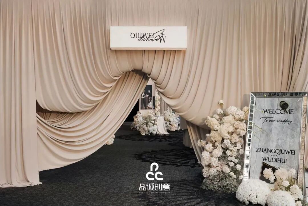 以咖啡色布幔打造的入场区,氛围感十足,宾客沉浸打卡感受浪漫氛围。