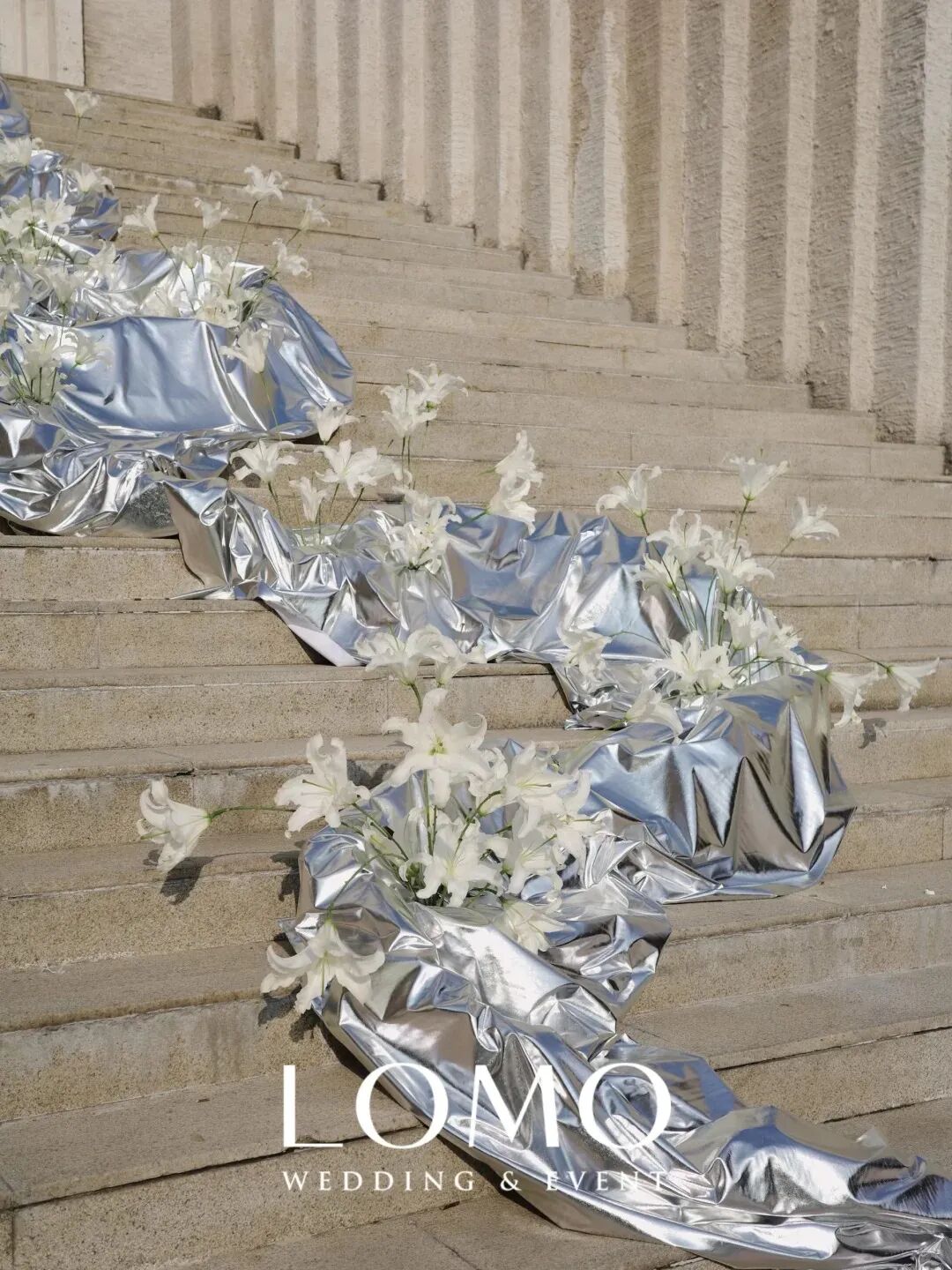 银色帷幔汇聚在油画院的楼梯上,搭配纯白色的花艺,是干净纯粹的浪漫。